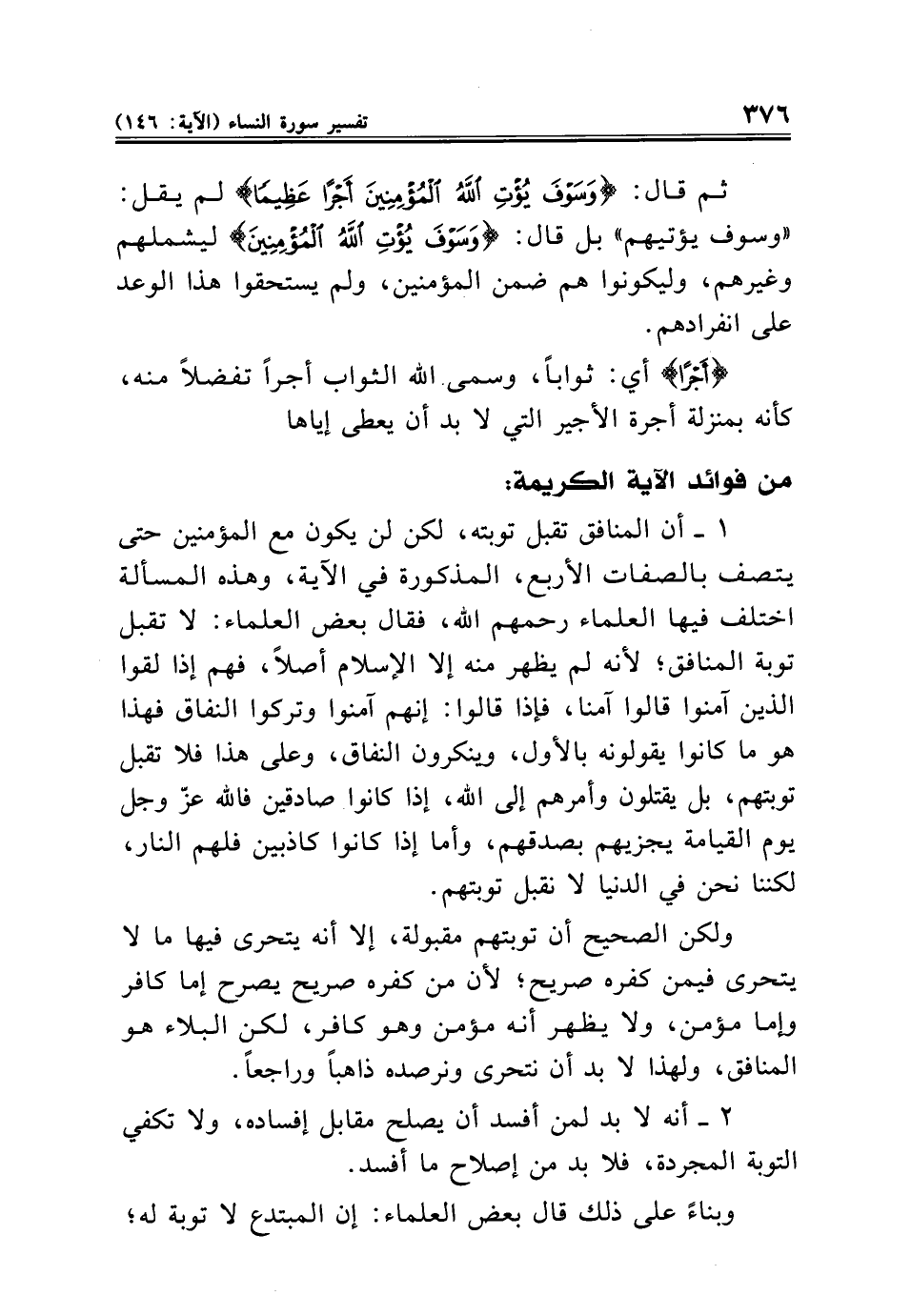 ثم قال: {وَسَوْفَ يُؤْتِ اللَّهُ الْمُؤْمِنِينَ أَجْرًا عَظِيمًا} لم يقل: "وسوف يؤتيهم" بل قال: {وَسَوْفَ يُؤْتِ اللَّهُ الْمُؤْمِنِينَ} ليشملهم وغيرهم، وليكونوا هم ضمن المؤمنين، ولم يستحقوا هذا الوعد على انفرادهم.