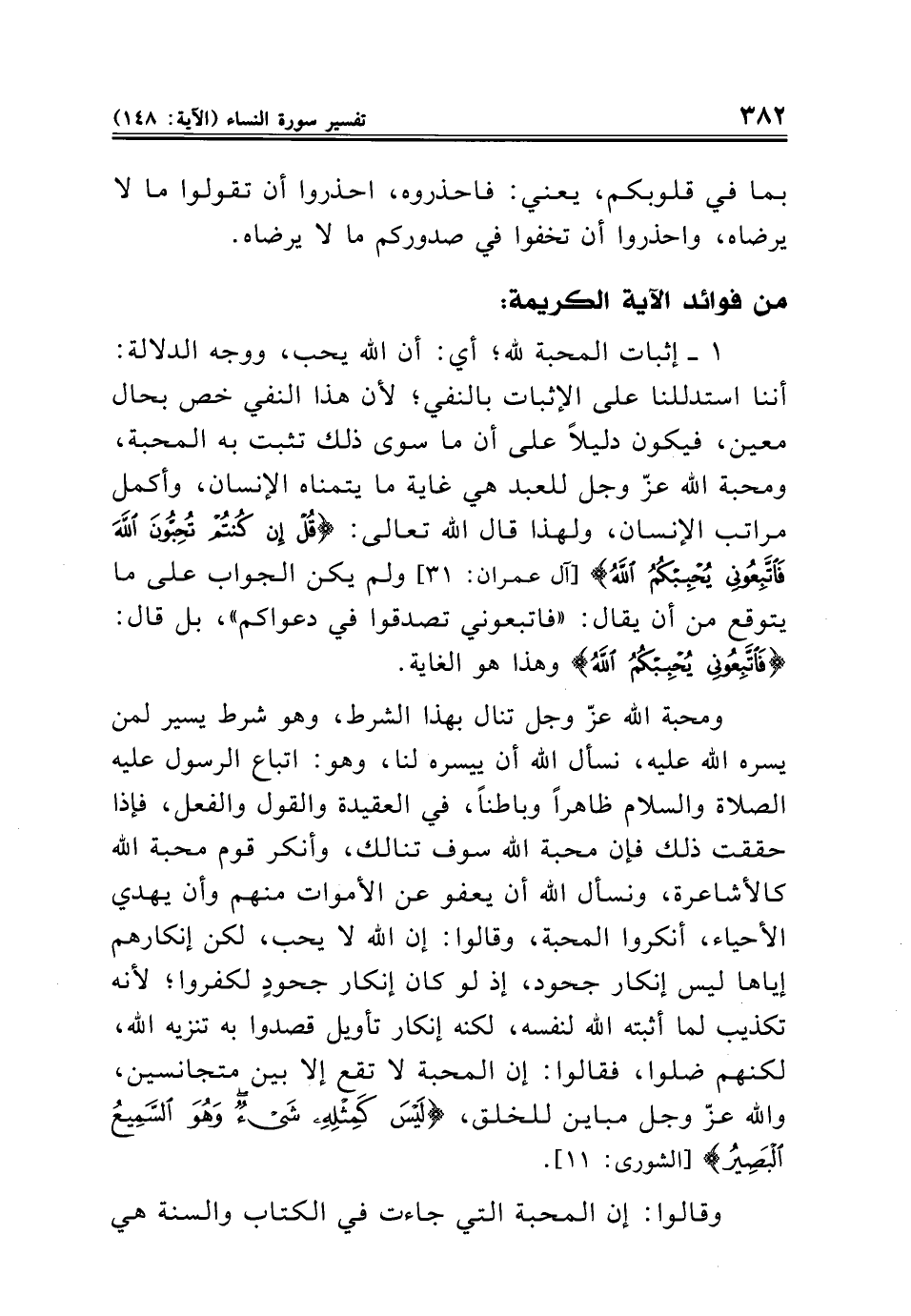 ومحبة الله عزّ وجل تنال بهذا الشرط، وهو شرط يسير لمن يسره الله عليه، نسأل الله أن ييسره لنا، وهو: اتباع الرسول عليه الصلاة والسلام ظاهرًا وباطنًا، في العقيدة والقول والفعل، فإذا حققت ذلك فإن محبة الله سوف تنالك، وأنكر قوم محبة الله كالأشاعرة، ونسأل الله أن يعفو عن الأموات منهم وأن يهدي الأحياء، أنكروا المحبة، وقالوا: إن الله لا يحب، لكن إنكارهم إياها ليس إنكار جحود، إذ لو كان إنكار جحودٍ لكفروا؛ لأنه تكذيب لما أثبته الله لنفسه، لكنه إنكار تأويل قصدوا به تنزيه الله، لكنهم ضلوا، فقالوا: إن المحبة لا تقع إلا بين متجانسين، والله عزّ وجل مباين للخلق، {لَيْسَ كَمِثْلِهِ شَيْءٌ وَهُوَ السَّمِيعُ الْبَصِيرُ} [الشورى: ١١].
