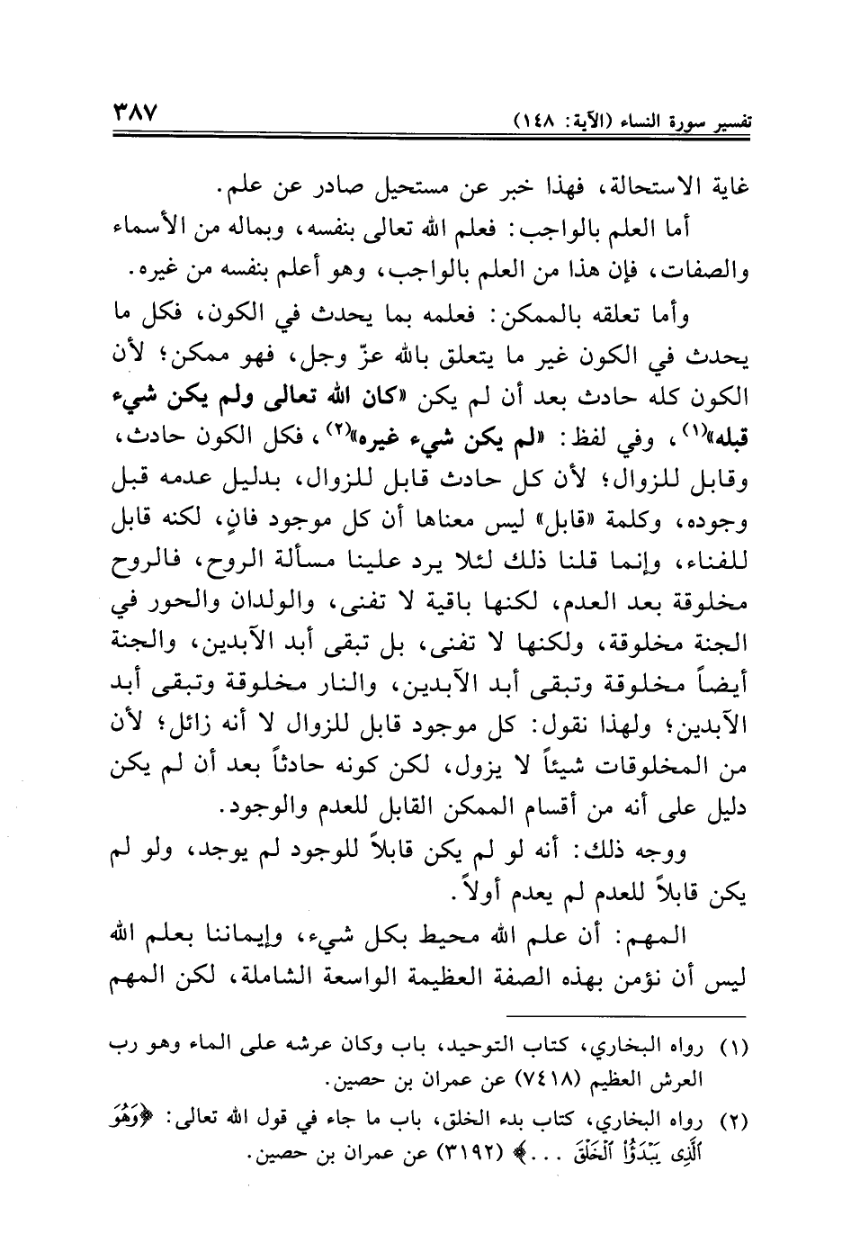 وأما تعلقه بالممكن: فعلمه بما يحدث في الكون، فكل ما يحدث في الكون غير ما يتعلق بالله عزّ وجل، فهو ممكن؛ لأن الكون كله حادث بعد أن لم يكن "كان الله تعالى ولم يكن شيء قبله" (¬١)، وفي لفظ: "لم يكن شيء غيره" (¬٢)، فكل الكون حادث، وقابل للزوال؛ لأن كل حادث قابل للزوال، بدليل عدمه قبل وجوده، وكلمة "قابل" ليس معناها أن كل موجود فانٍ، لكنه قابل للفناء، وإنما قلنا ذلك لئلا يرد علينا مسألة الروح، فالروح مخلوقة بعد العدم، لكنها باقية لا تفنى، والولدان والحور في الجنة مخلوقة، ولكنها لا تفنى، بل تبقى أبد الآبدين، والجنة أيضًا مخلوقة وتبقى أبد الآبدين، والنار مخلوقة وتبقى أبد الآبدين؛ ولهذا نقول: كل موجود قابل للزوال لا أنه زائل؛ لأن من المخلوقات شيئًا لا يزول، لكن كونه حادثًا بعد أن لم يكن دليل على أنه من أقسام الممكن القابل للعدم والوجود.
