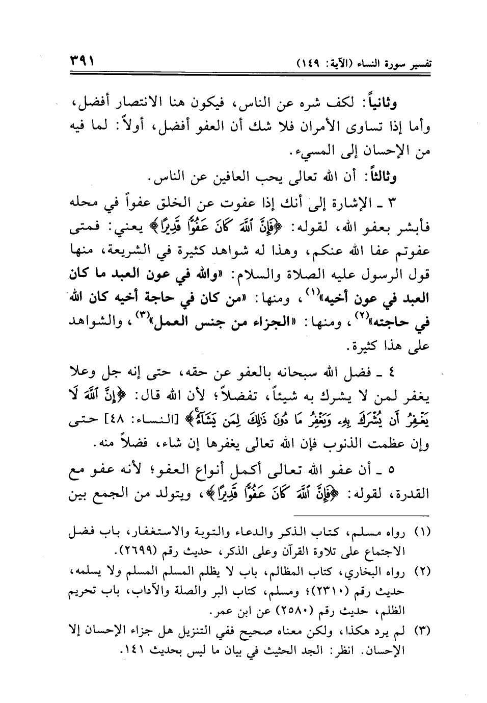 ٣ - الإشارة إلى أنك إذا عفوت عن الخلق عفوًا في محله فأبشر بعفو الله، لقوله: {فَإِنَّ اللَّهَ كَانَ عَفُوًّا قَدِيرًا} يعني: فمتى عفوتم عفا الله عنكم، وهذا له شواهد كثيرة في الشريعة، منها قول الرسول عليه الصلاة والسلام: "والله في عون العبد ما كان العبد في عون أخيه" (¬١)، ومنها: "من كان في حاجة أخيه كان الله في حاجته" (¬٢)، ومنها: "الجزاء من جنس العمل" (¬٣)، والشواهد على هذا كثيرة.