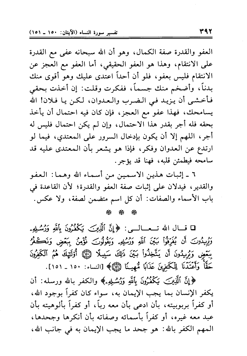 * قال الله تعالى: {إِنَّ الَّذِينَ يَكْفُرُونَ بِاللَّهِ وَرُسُلِهِ وَيُرِيدُونَ أَنْ يُفَرِّقُوا بَيْنَ اللَّهِ وَرُسُلِهِ وَيَقُولُونَ نُؤْمِنُ بِبَعْضٍ وَنَكْفُرُ بِبَعْضٍ وَيُرِيدُونَ أَنْ يَتَّخِذُوا بَيْنَ ذَلِكَ سَبِيلًا (١٥٠) أُولَئِكَ هُمُ الْكَافِرُونَ حَقًّا وَأَعْتَدْنَا لِلْكَافِرِينَ عَذَابًا مُهِينًا (١٥١)} [النساء: ١٥٠ - ١٥١].