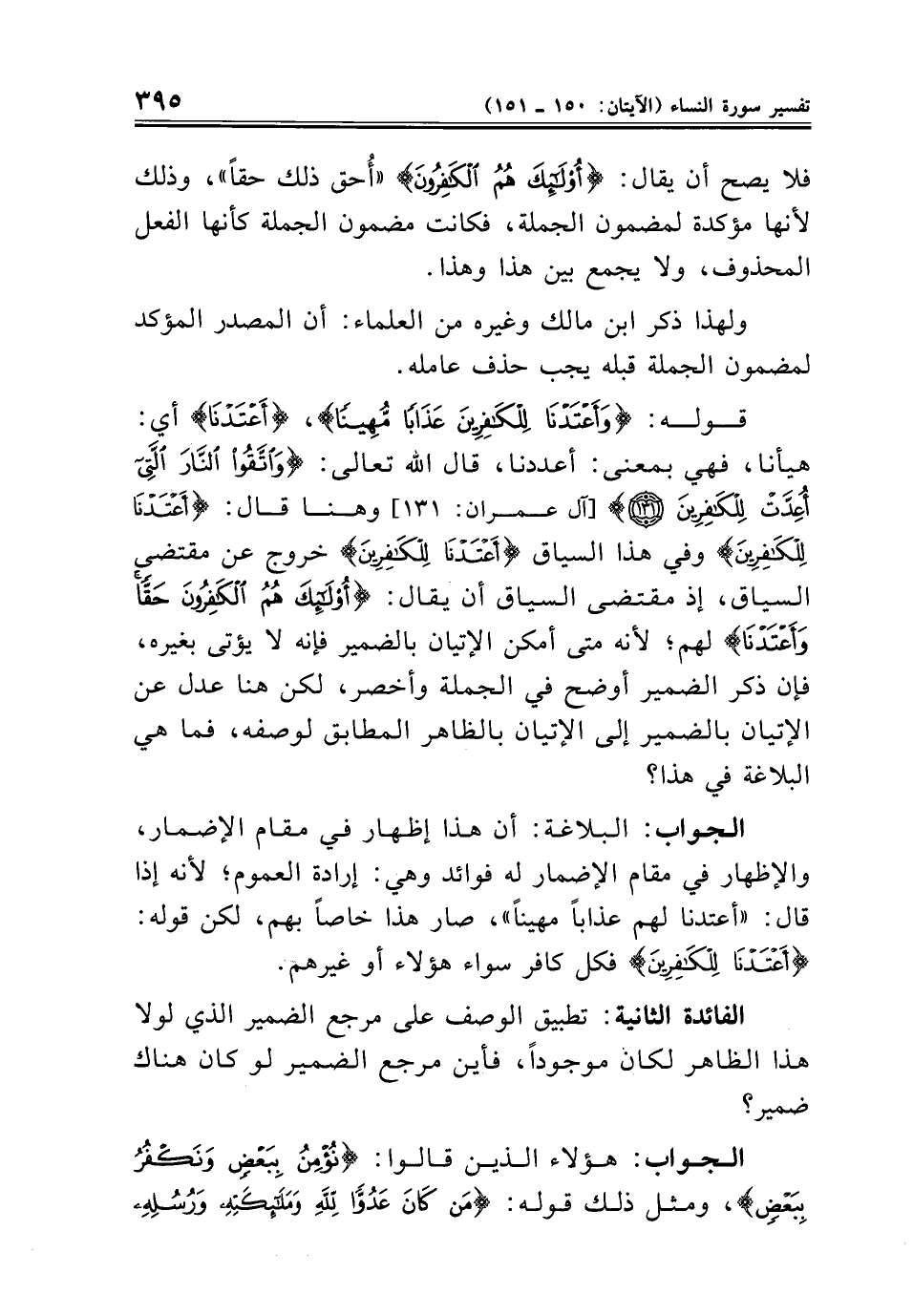 قوله: {وَأَعْتَدْنَا لِلْكَافِرِينَ عَذَابًا مُهِينًا}، {وَأَعْتَدْنَا} أي: هيأنا، فهي بمعنى: أعددنا، قال الله تعالى: {وَاتَّقُوا النَّارَ الَّتِي أُعِدَّتْ لِلْكَافِرِينَ (١٣١)} [آل عمران: ١٣١] وهنا قال: {وَأَعْتَدْنَا لِلْكَافِرِينَ} وفي هذا السياق {وَأَعْتَدْنَا لِلْكَافِرِينَ} خروج عن مقتضى السياق، إذ مقتضى السياق أن يقال: {أُولَئِكَ هُمُ الْكَافِرُونَ حَقًّا وَأَعْتَدْنَا} لهم؛ لأنه متى أمكن الإتيان بالضمير فإنه لا يؤتى بغيره، فإن ذكر الضمير أوضح في الجملة وأخصر، لكن هنا عدل عن الإتيان بالضمير إلى الإتيان بالظاهر المطابق لوصفه، فما هي البلاغة في هذا؟