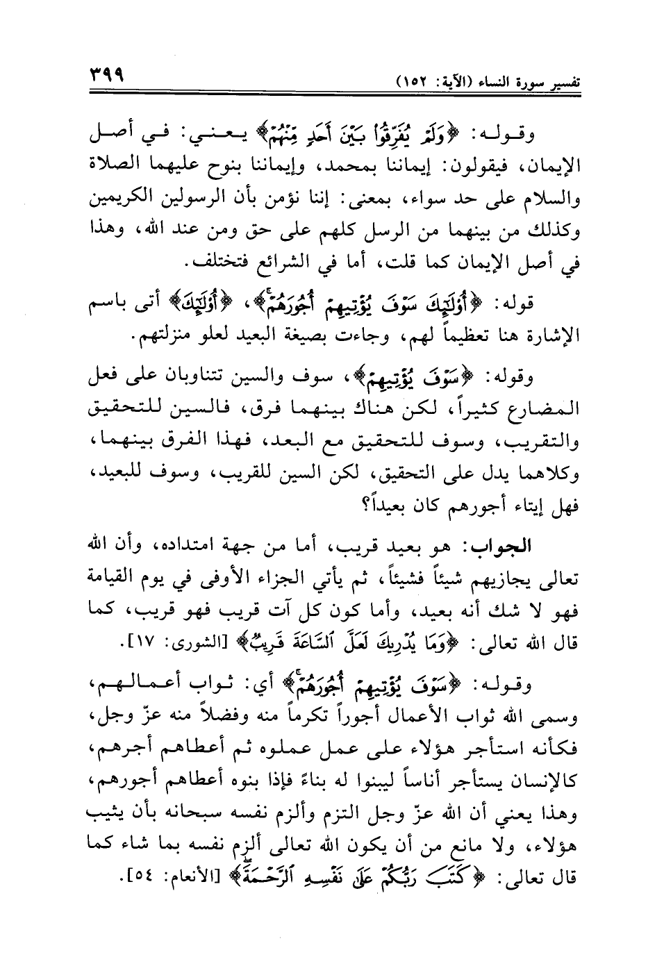 وقوله: {سَوْفَ يُؤْتِيهِمْ}، سوف والسين تتناوبان على فعل المضارع كثيرًا، لكن هناك بينهما فرق، فالسين للتحقيق والتقريب، وسوف للتحقيق مع البعد، فهذا الفرق بينهما، وكلاهما يدل على التحقيق، لكن السين للقريب، وسوف للبعيد، فهل إيتاء أجورهم كان بعيدًا؟