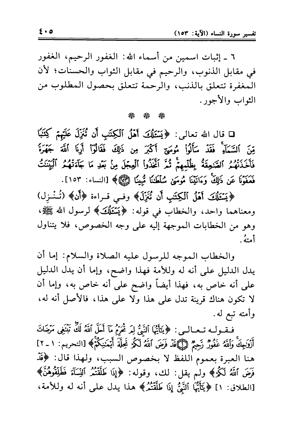 {يَسْأَلُكَ أَهْلُ الْكِتَابِ أَنْ تُنَزِّلَ} وفي قراءة {أَنْ} (تُنْزِل) ومعناهما واحد، والخطاب في قوله: {يَسْأَلُكَ} لرسول الله - صلى الله عليه وسلم -، وهو من الخطابات الموجهة إليه على وجه الخصوص، فلا يتناول أمتهُ.