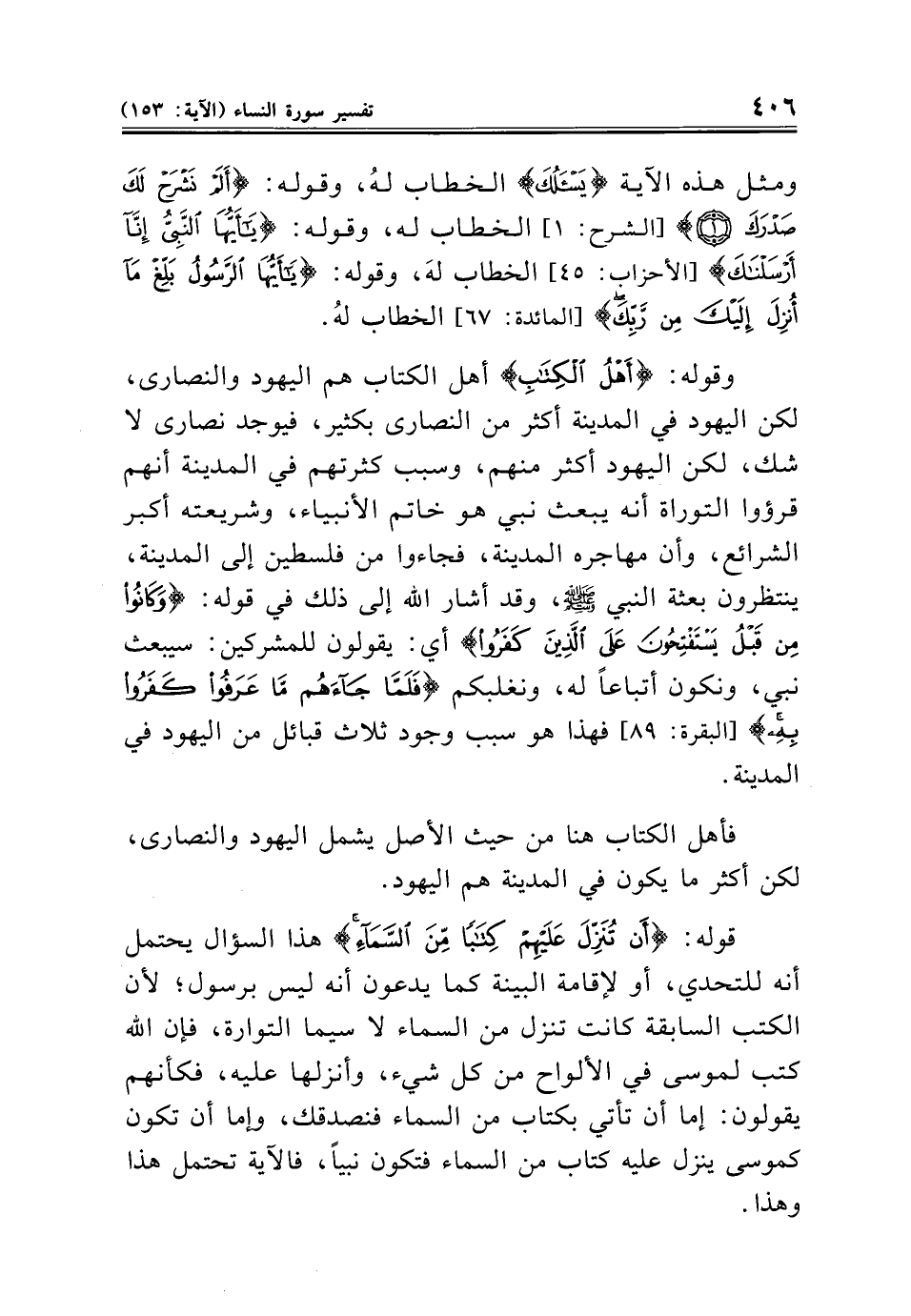 قوله: {أَنْ تُنَزِّلَ عَلَيْهِمْ كِتَابًا مِنَ السَّمَاءِ} هذا السؤال يحتمل أنه للتحدي، أو لإقامة البينة كما يدعون أنه ليس برسول؛ لأن الكتب السابقة كانت تنزل من السماء لا سيما التوارة، فإن الله كتب لموسى في الألواح من كل شيء، وأنزلها عليه، فكأنهم يقولون: إما أن تأتي بكتاب من السماء فنصدقك، وإما أن تكون كموسى ينزل عليه كتاب من السماء فتكون نبيًا، فالآية تحتمل هذا وهذا.