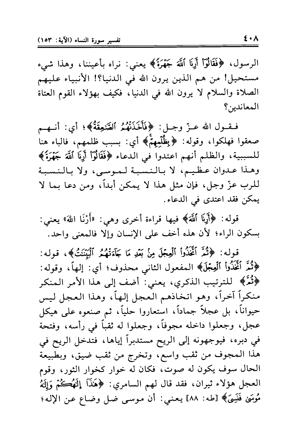 الرسول، {فَقَالُوا أَرِنَا اللَّهَ جَهْرَةً} يعني: نراه بأعيننا، وهذا شيء مستحيل! من هم الذين يرون الله في الدنيا؟ ! الأنبياء عليهم الصلاة والسلام لا يرون الله في الدنيا، فكيف بهؤلاء القوم العتاة المعاندين؟