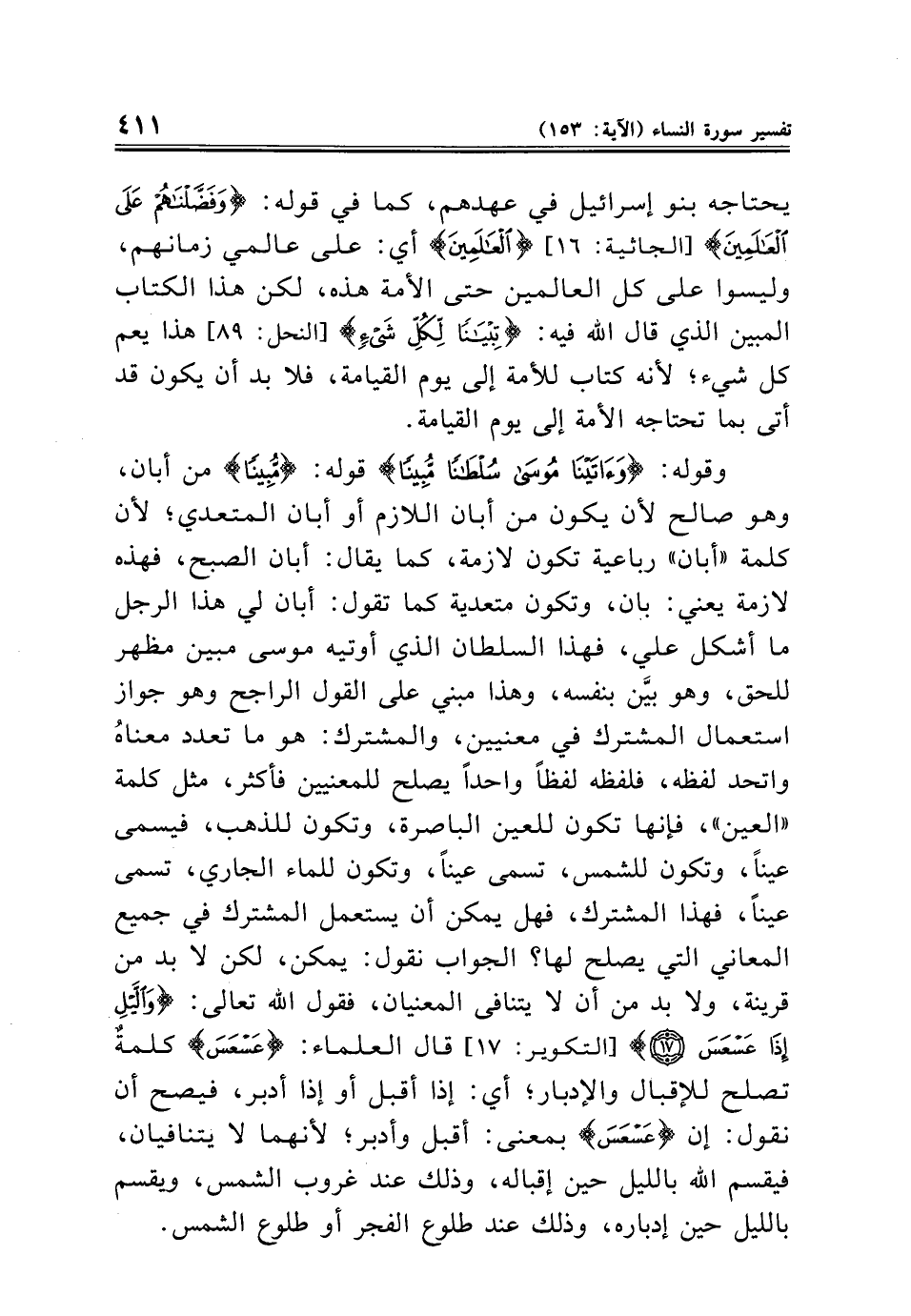 وقوله: {وَآتَيْنَا مُوسَى سُلْطَانًا مُبِينًا} قوله: {وَآتَيْنَا} من أبان، وهو صالح لأن يكون من أبان اللازم أو أبان المتعدي؛ لأن كلمة "أبان" رباعية تكون لازمة، كما يقال: أبان الصبح، فهذه لازمة يعني: بأن، وتكون متعدية كما تقول: أبان لي هذا الرجل ما أشكل علي، فهذا السلطان الذي أوتيه موسى مبين مظهر للحق، وهو بيَّن بنفسه، وهذا مبني على القول الراجح وهو جواز استعمال المشترك في معنيين، والمشترك: هو ما تعدد معناهُ واتحد لفظه، فلفظه لفظًا واحدًا يصلح للمعنيين فأكثر، مثل كلمة "العين"، فإنها تكون للعين الباصرة، وتكون للذهب، فيسمى عينًا، وتكون للشمس، تسمى عينًا، وتكون للماء البخاري، تسمى عينًا، فهذا المشترك، فهل يمكن أن يستعمل المشترك في جميع المعاني التي يصلح لها؟ الجواب نقول: يمكن، لكن لا بد من قرينة، ولا بد من أن لا يتنافى المعنيان، فقول الله تعالى: {وَاللَّيْلِ إِذَا عَسْعَسَ (١٧)} [التكوير: ١٧] قال العلماء: {عَسْعَسَ} كلمةٌ تصلح للإقبال والإدبار؛ أي: إذا أقبل أو إذا أدبر، فيصح أن نقول: إن {عَسْعَسَ} بمعنى: أقبل وأدبر؛ لأنهما لا يتنافيان، فيقسم الله بالليل حين إقباله، وذلك عند غروب الشمس، ويقسم بالليل حين إدباره، وذلك عند طلوع الفجر أو طلوع الشمس.