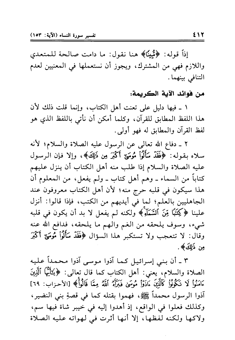 ٢ - دفاع الله تعالى عن الرسول عليه الصلاة والسلام؛ لأنه سلاه بقوله: {فَقَدْ سَأَلُوا مُوسَى أَكْبَرَ مِنْ ذَلِكَ}، وإلا فإن الرسول عليه الصلاة والسلام إذا طلب منه أهل الكتاب أن ينزل عليهم كتابًا من السماء - وهم أهل كتاب - ولم يفعل، من المعلوم أن هذا سيكون في قلبه حرج منه؛ لأن أهل الكتاب معروفون عند الجاهليين بالعلم؛ لما في أيديهم من الكتب، فإذا قالوا: أنزل علينا {كِتَابًا مِنَ السَّمَاءِ} ولكنه لم يفعل لا بد أن يكون في قلبه شيء، وسوف يلحقه من الغم والهم ما يلحقه، فدافع الله عنه وقال: لا تتعجب ولا تستكبر هذا السؤال {فَقَدْ سَأَلُوا مُوسَى أَكْبَرَ مِنْ ذَلِكَ}.