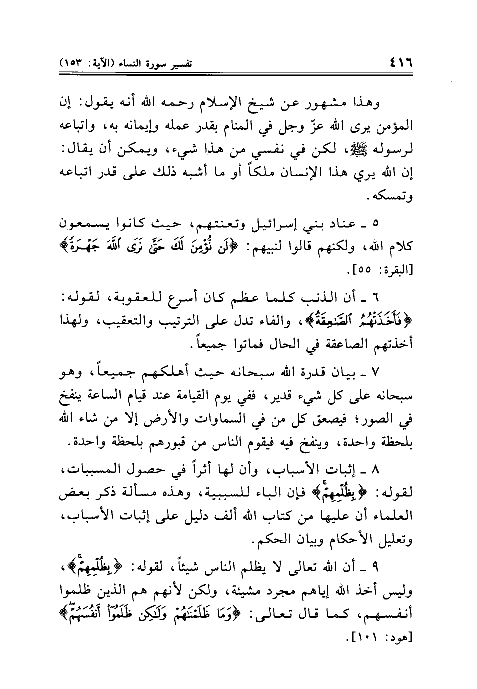 ٨ - إثبات الأسباب، وأن لها أثرًا في حصول المسببات، لقوله: {بِظُلْمِهِمْ} فإن الباء للسببية، وهذه مسألة ذكر بعض العلماء أن عليها من كتاب الله ألف دليل على إثبات الأسباب، وتعليل الأحكام وبيان الحكم.