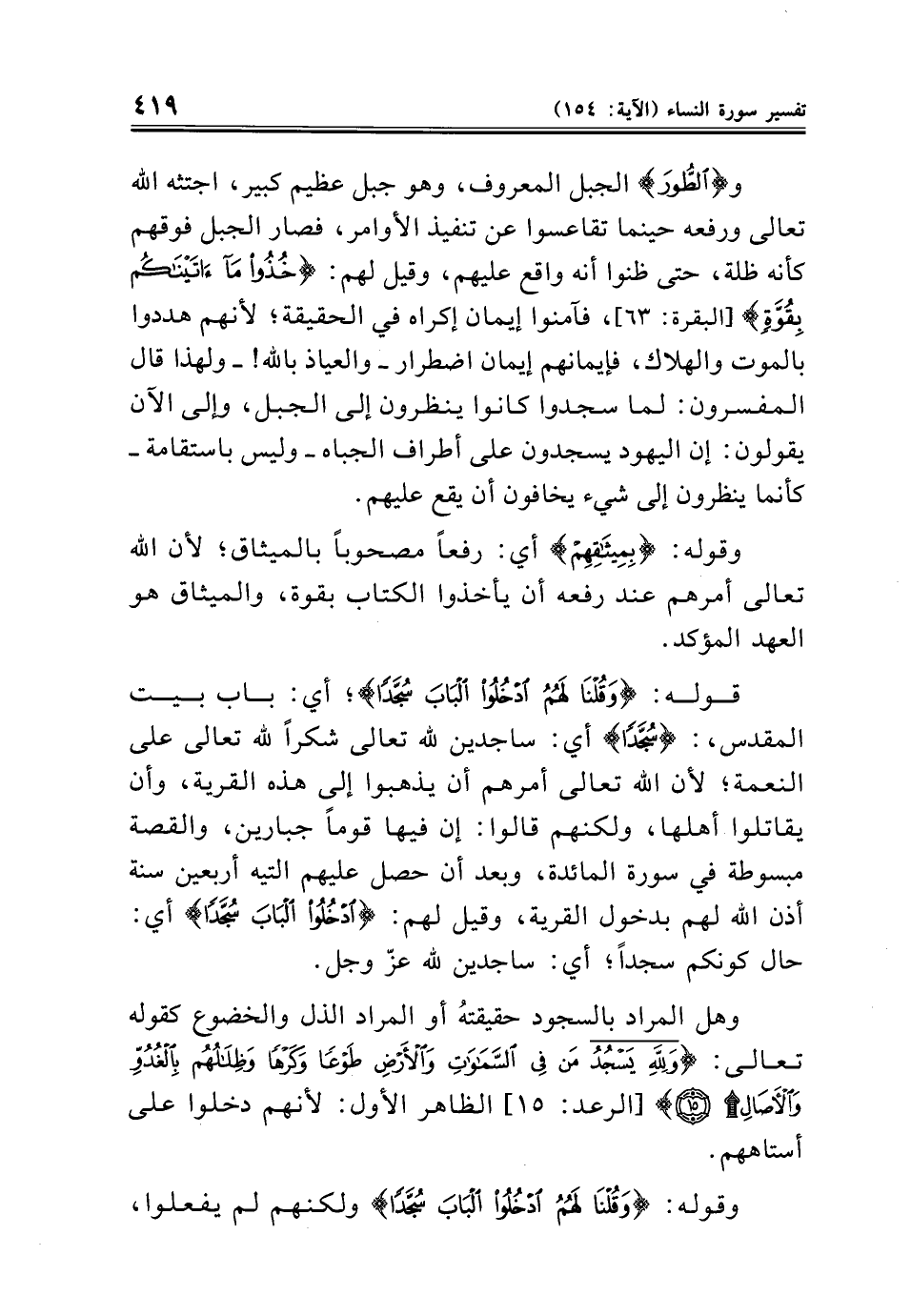 و {الطُّورَ} الجبل المعروف، وهو جبل عظيم كبير، اجتثه الله تعالى ورفعه حينما تقاعسوا عن تنفيذ الأوامر، فصار الجبل فوقهم كأنه ظلة، حتى ظنوا أنه واقع عليهم، وقيل لهم: {خُذُوا مَا آتَيْنَاكُمْ بِقُوَّةٍ} [البقرة: ٦٣] , فآمنوا إيمان إكراه في الحقيقة؛ لأنهم هددوا بالموت والهلاك، فإيمانهم إيمان اضطرار - والعياذ بالله! - ولهذا قال المفسرون: لما سجدوا كانوا ينظرون إلى الجبل، وإلى الآن يقولون: إن اليهود يسجدون على أطراف الجباه - وليس باستقامة - كأنما ينظرون إلى شيء يخافون أن يقع عليهم.