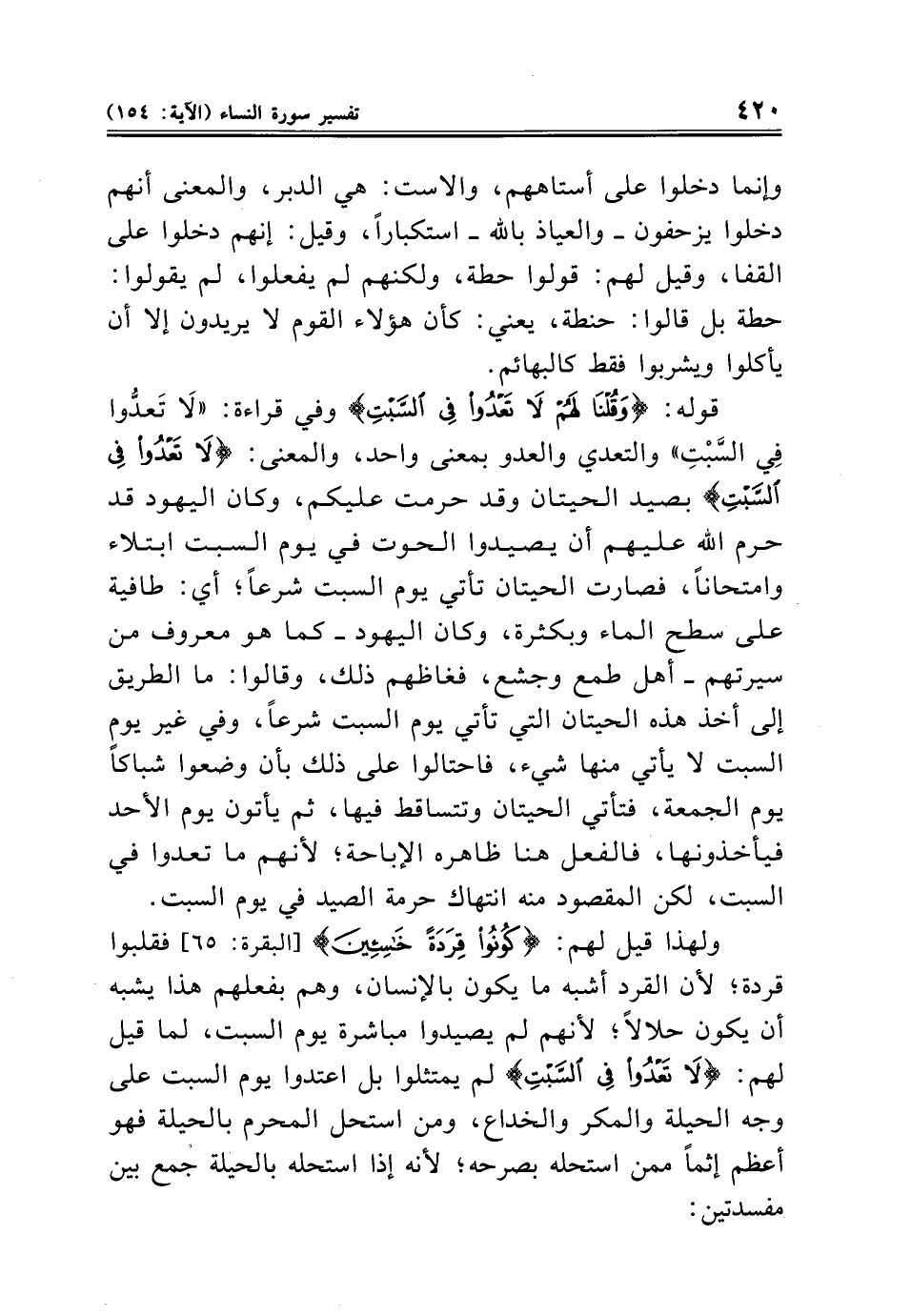 قوله: {وَقُلْنَا لَهُمْ لَا تَعْدُوا فِي السَّبْتِ} وفي قراءة: "لَا تَعدُّوا في السَّبْتِ" والتعدي والعدو بمعنى واحد، والمعنى: {لَا تَعْدُوا فِي السَّبْتِ} بصيد الحيتان وقد حرمت عليكم، وكان اليهود قد حرم الله عليهم أن يصيدوا الحوت في يوم السبت ابتلاء وامتحانًا، فصارت الحيتان تأتي يوم السبت شرعًا، أي: طافية على سطح الماء وبكثرة، وكان اليهود - كما هو معروف من سيرتهم - أهل طمع وجشع، فغاظهم ذلك، وقالوا: ما الطريق إلى أخذ هذه الحيتان التي تأتي يوم السبت شرعًا، وفي غير يوم السبت لا يأتي منها شيء، فاحتالوا على ذلك بأن وضعوا شباكًا يوم الجمعة، فتأتي الحيتان وتتساقط فيها، ثم يأتون يوم الأحد فيأخذونها، فالفعل هنا ظاهره الإباحة؛ لأنهم ما تعدوا في السبت، لكن المقصود منه انتهاك حرمة الصيد في يوم السبت.