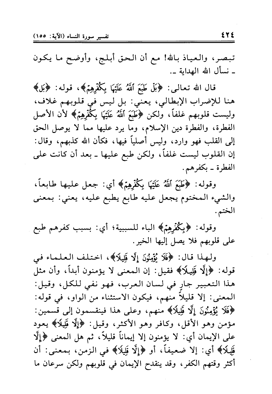 قال الله تعالى: {بَلْ طَبَعَ اللَّهُ عَلَيْهَا بِكُفْرِهِمْ}، قوله: {بَلْ} هنا للإضراب الإبطالي، يعني: بل ليس في قلوبهم غلاف، وليست قلوبهم غلفًا، ولكن {طَبَعَ اللَّهُ عَلَيْهَا بِكُفْرِهِمْ} لأن الأصل الفطرة، والفطرة دين الإِسلام، وما يرد عليها مما لا يوصل الحق إلى القلب فهو وارد، وليس أصليًا فيها، فكأن الله كذبهم، وقال: إن القلوب ليست غلفًا، ولكن طبع عليها - بعد أن كانت على الفطرة - بكفرهم.