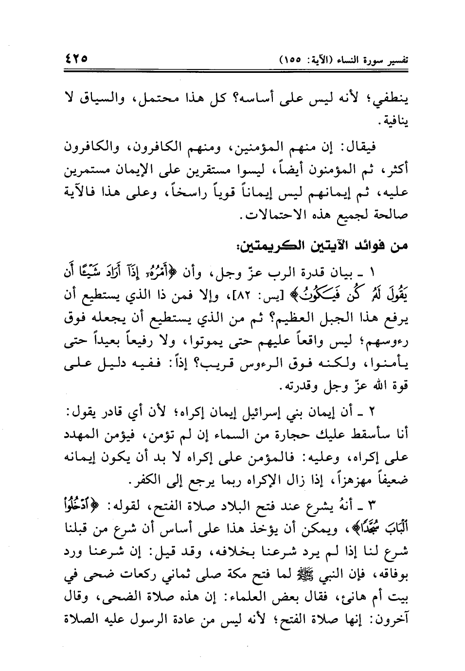 ٢ - أن إيمان بني إسرائيل إيمان إكراه؛ لأن أي قادر يقول: أنا سأسقط عليك حجارة من السماء إن لم تؤمن، فيؤمن المهدد على إكراه، وعليه: فالمؤمن على إكراه لا بد أن يكون إيمانه ضعيفًا مهزهزًا، إذا زال الإكراه ربما يرجع إلى الكفر.