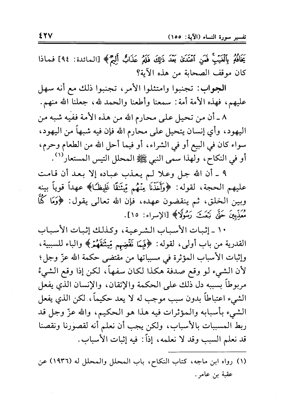 ١٠ - إثبات الأسباب الشرعية، وكذلك إثبات الأسباب القدرية من باب أولى، لقوله: {فَبِمَا نَقْضِهِمْ مِيثَاقَهُمْ} والباء للسببية، وإثبات الأسباب المؤثرة في مسبباتها من مقتضى حكمة الله عزّ وجل؛ لأن الشيء لو وقع صدفة هكذا لكان سفهًا، لكن إذا وقع الشيءُ مربوطًا بسببه دل ذلك على الحكمة والإتقان، والإنسان الذي يفعل الشيء اعتباطًا بدون سبب موجب له لا يعد حكيمًا، لكن الذي يفعل الشيء بأسبابه والمؤثرات فيه هذا هو الحكيم، والله عزّ وجل قد ربط المسببات بالأسباب، ولكن يجب أن نعلم أنه لقصورنا ونقصنا قد نعلم السبب وقد لا نعلمه، إذًا: فيه إثبات الأسباب.