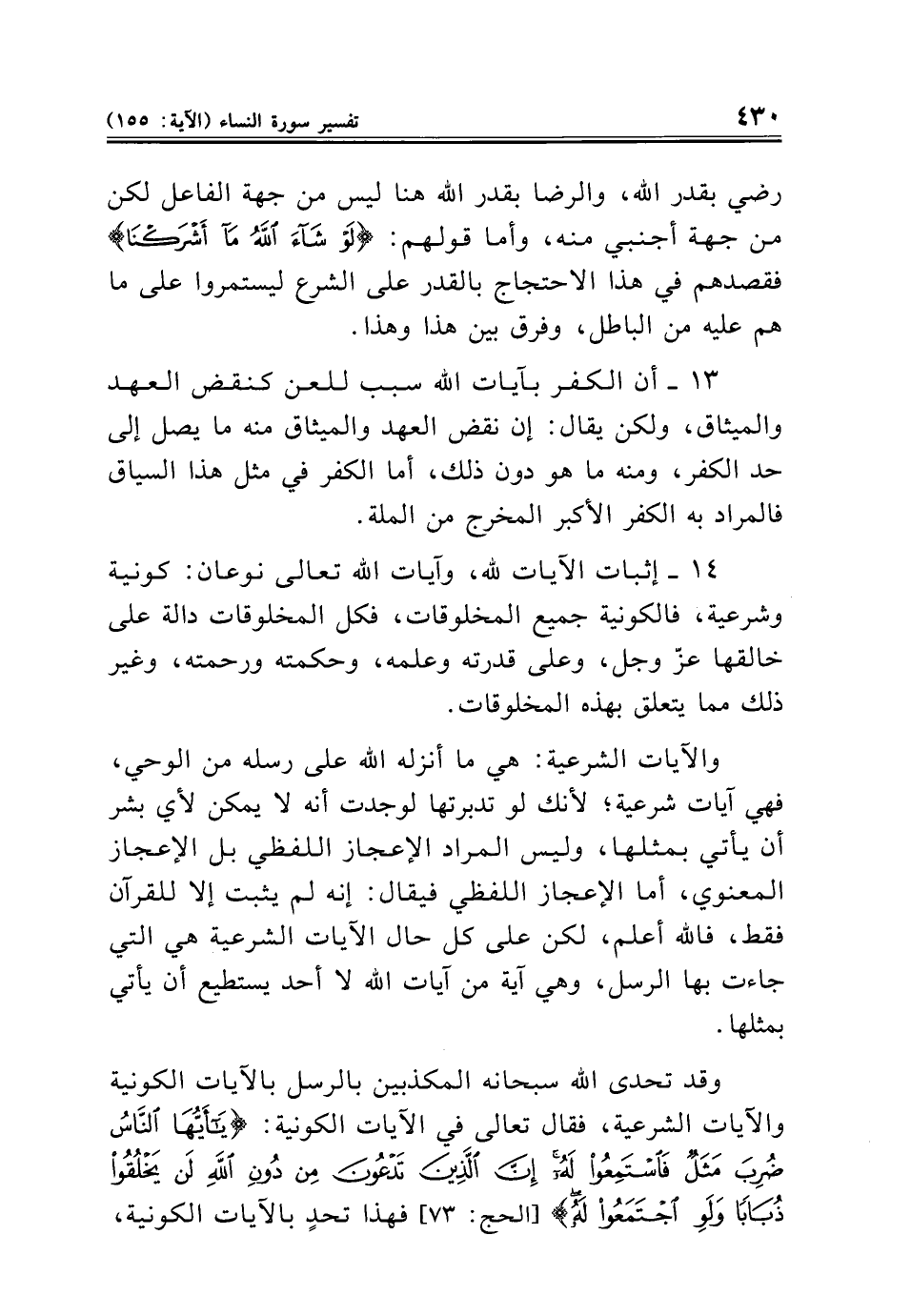 ١٣ - أن الكفر بآيات الله سبب للعن كنقض العهد والميثاق، ولكن يقال: إن نقض العهد والميثاق منه ما يصل إلى حد الكفر، ومنه ما هو دون ذلك، أما الكفر في مثل هذا السياق فالمراد به الكفر الأكبر المخرج من الملة.