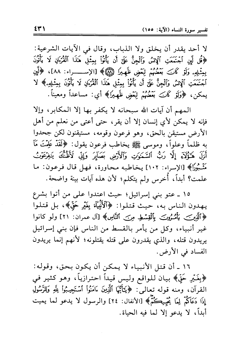 ١٦ - أن قتل الأنبياء لا يمكن أن يكون بحق، وقوله: {بِغَيْرِ حَقٍّ} بيان للواقع وليس قيدًا احترازيًا، وهو كثير في القرآن، ومنه قوله تعالى: {يَاأَيُّهَا الَّذِينَ آمَنُوا اسْتَجِيبُوا لِلَّهِ وَلِلرَّسُولِ إِذَا دَعَاكُمْ لِمَا يُحْيِيكُم} [الأنفال: ٢٤] والرسول لا يدعو لما يميت أبدًا، لا يدعو إلا لما فيه الحياة.