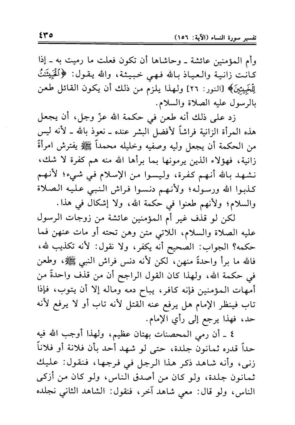 زد على ذلك أنه طعن في حكمة الله عزّ وجل، أن يجعل هذه المرأة الزانية فراشًا لأفضل البشر عنده - نعوذ بالله - لأنه ليس من الحكمة أن يجعل وليه وصفيه وخليله محمدًا - صلى الله عليه وسلم - يفترش امرأةً زانية، فهؤلاء الذين يرمونها بما برأها الله منه هم كفرة لا شك، نشهد بالله أنهم كفرة، وليسوا من الإسلام في شيء؛ لأنهم كذبوا الله ورسوله؛ ولأنهم دنسوا فراش النبي عليه الصلاة والسلام؛ ولأنهم طعنوا في حكمة الله، ولا إشكال في هذا.