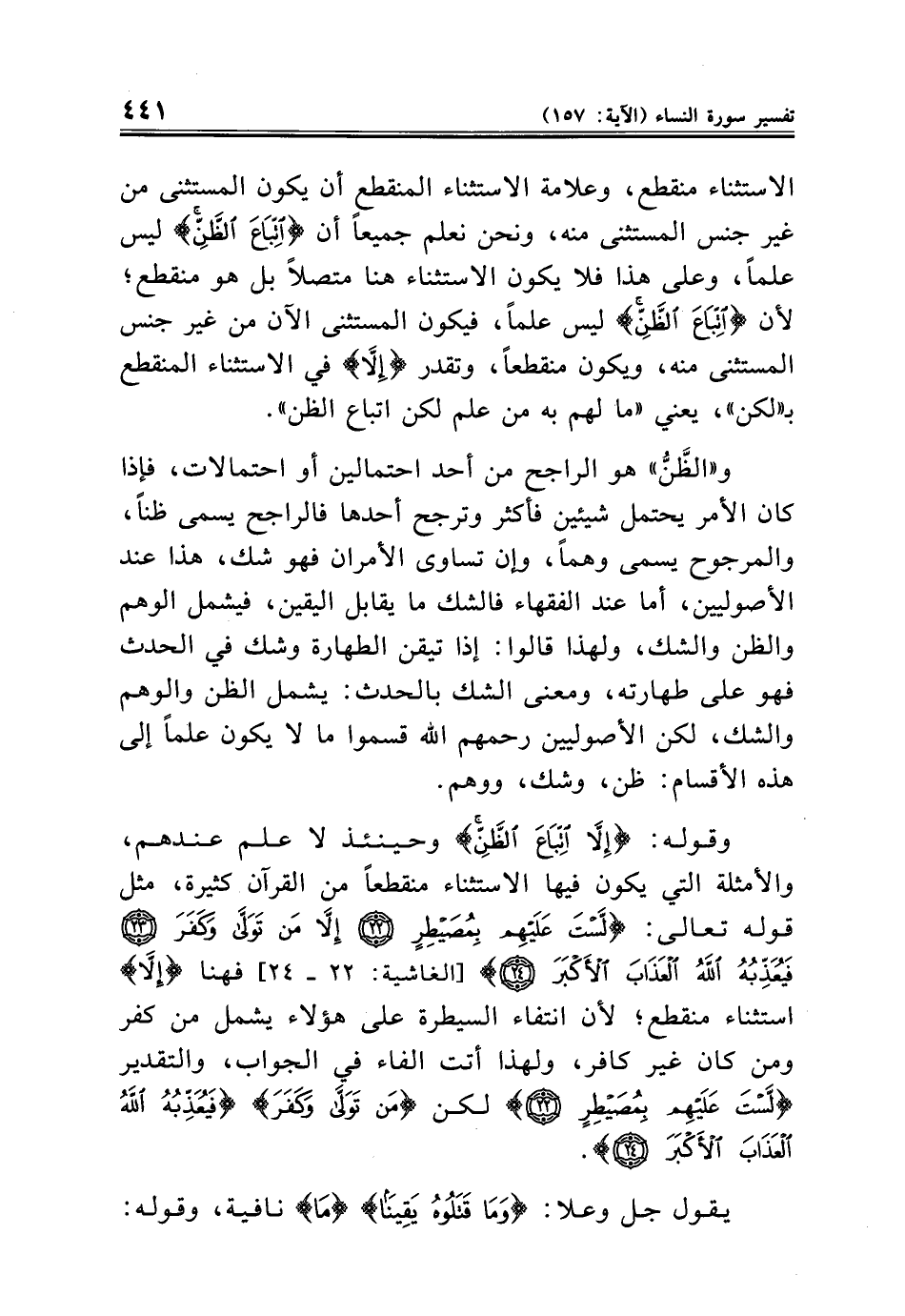 وقوله: {إِلَّا اتِّبَاعَ الظَّنِّ} وحينئذ لا علم عندهم، والأمثلة التي يكون فيها الإستثناء منقطعًا من القرآن كثيرة، مثل قوله تعالى: {لَسْتَ عَلَيْهِمْ بِمُصَيْطِرٍ (٢٢) إِلَّا مَنْ تَوَلَّى وَكَفَرَ (٢٣) فَيُعَذِّبُهُ اللَّهُ الْعَذَابَ الْأَكْبَرَ (٢٤)} [الغاشية: ٢٢ - ٢٤] فهنا {إِلَّا} استثناء منقطع؛ لأن انتفاء السيطرة على هؤلاء يشمل من كفر ومن كان غير كافر، ولهذأ أتت الفاء في الجواب، والتقدير {لَسْتَ عَلَيْهِمْ بِمُصَيْطِرٍ (٢٢)} لكن {مَنْ تَوَلَّى وَكَفَرَ} {فَيُعَذِّبُهُ اللَّهُ الْعَذَابَ الْأَكْبَرَ (٢٤)}.