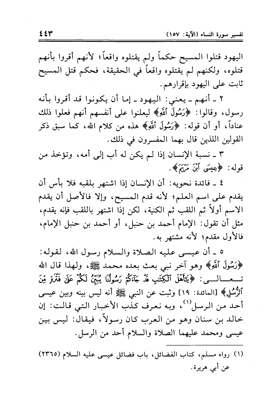 ٤ - فائدة نحوية: أن الإنسان إذا اشتهر بلقبه فلا بأس أن يقدم على اسم العلم؛ لأنه قدم المسيح، وإلا فالأصل أن يقدم الإسم أولًا ثم اللقب ثم الكنية، لكن إذا اشتهر باللقب فإنه يقدم، مثل أن تقول: الإمام أحمد بن حنبل، أو أحمد بن حنبل الإمام، فالأول مقدم؛ لأنه مشتهر به.