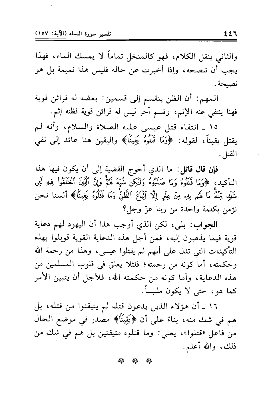 ١٥ - انتفاء قتل عيسى عليه الصلاة والسلام، وأنه لم يقتل يقينًا، لقوله: {وَمَا قَتَلُوهُ يَقِينًا} واليقين هنا عائد إلى نفي القتل.