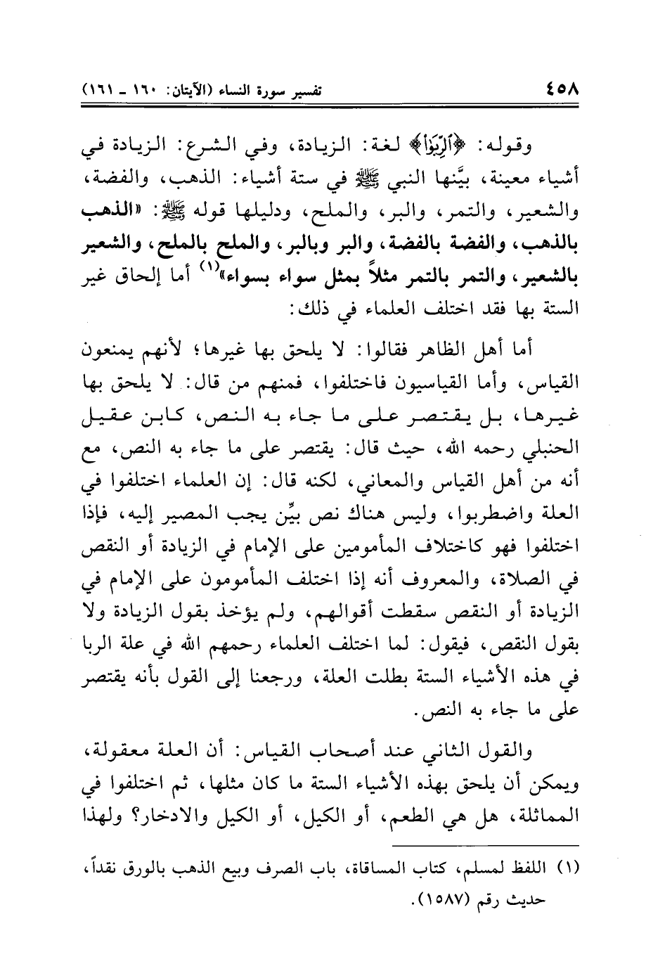وقوله: {الرِّبَا} لغة: الزيادة، وفي الشرع: الزيادة في أشياء معينة، بيَّنها النبي - صلى الله عليه وسلم - في ستة أشياء: الذهب، والفضة، والشعير، والتمر، والبر، والملح، ودليلها قوله - صلى الله عليه وسلم -: "الذهب بالذهب، والفضة بالفضة، والبر وبالبر، والملح بالملح، والشعير بالشعير، والتمر بالتمر مثلًا بمثل سواء بسواء" (¬١) أما إلحاق غير الستة بها فقد اختلف العلماء في ذلك: