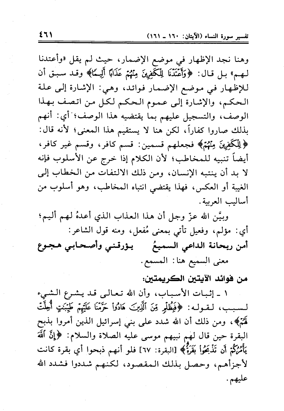 وهنا نجد الإظهار في موضع الإضمار، حيث لم يقل "وأعتدنا لهم" بل قال: {وَأَعْتَدْنَا لِلْكَافِرِينَ مِنْهُمْ عَذَابًا أَلِيمًا} وقد سبق أن للإظهار في موضع الإضمار فوائد، وهي: الإشارة إلى علة الحكم، والإشارة إلى عموم الحكم لكل من اتصف بهذا الوصف، والتسجيل عليهم بما يقتضيه هذا الوصف؛ أي: أنهم بذلك صاروا كفارًا، لكن هنا لا يستقيم هذا المعنى؛ لأنه قال: {لِلْكَافِرِينَ مِنْهُمْ} فجعلهم قسمين: قسم كافر، وقسم غير كافر، أيضًا تنبيه للمخاطب؛ لأن الكلام إذا خرج عن الأسلوب فإنه لا بد أن ينتبه الإنسان، ومن ذلك الإلتفات من الخطاب إلى الغيبة أو العكس، فهذا يقتضي انتباه المخاطب، وهو أسلوب من أساليب العربية.