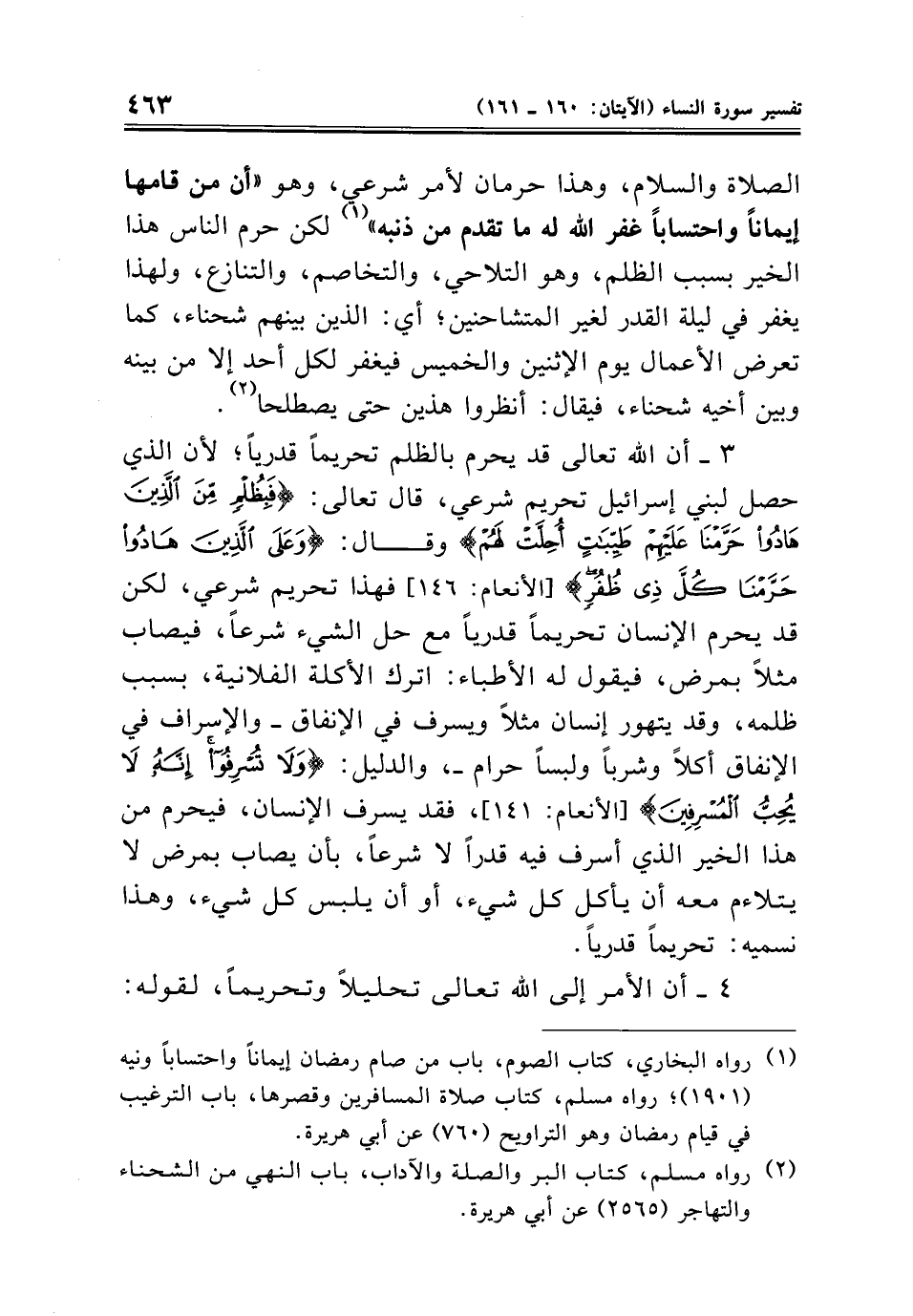 ٣ - أن الله تعالى قد يحرم بالظلم تحريمًا قدريًا، لأن الذي حصل لبني إسرائيل تحريم شرعي، قال تعالى: {فَبِظُلْمٍ مِنَ الَّذِينَ هَادُوا حَرَّمْنَا عَلَيْهِمْ طَيِّبَاتٍ أُحِلَّتْ لَهُمْ} وقال: {وَعَلَى الَّذِينَ هَادُوا حَرَّمْنَا كُلَّ ذِي ظُفُرٍ} [الأنعام: ١٤٦] فهذا تحريم شرعي، لكن قد يحرم الإنسان تحريمًا قدريًا مع حل الشيء شرعًا، فيصاب مثلًا بمرض، فيقول له الأطباء: اترك الأكلة الفلانية، بسبب ظلمه، وقد يتهور إنسان مثلًا ويسرف في الإنفاق - والإسراف في الإنفاق أكلًا وشربًا ولبسًا حرام -، والدليل: {وَلَا تُسْرِفُوا إِنَّهُ لَا يُحِبُّ الْمُسْرِفِينَ} [الأنعام: ١٤١]، فقد يسرف الإنسان، فيحرم من هذا الخير الذي أسرف فيه قدرًا لا شرعًا، بأن يصاب بمرض لا يتلاءم معه أن يأكل كل شيء، أو أن يلبس كل شيء، وهذا نسميه: تحريمًا قدريًا.
