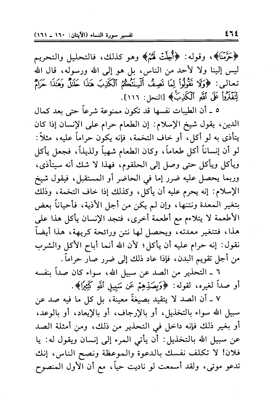 ٥ - أن الطيبات نفسها قد تكون ممنوعة شرعًا حتى بعد كمال الدين، يقول شيخ الإسلام: إن الطعام حرام على الإنسان إذا كان يتأذى به لو أكل، أو خاف التخمة، فإنه يكون حرامًا عليه، مثلًا: لو أن إنسانًا أكل طعامًا، وكان الطعام شهيًا ولذيذًا، فجعل يأكل ويأكل ويأكل حتى وصل إلى الحلقوم، فهذا لا شك أنه سيتأذى، وربما يحصل عليه ضرر إما في الحاضر أو المستقبل، فيقول شيخ الإسلام: إنه يحرم عليه أن يأكل، وكذلك إذا خاف التخمة، وذلك بتغير المعدة ونتنها، وإن لم يكن من أجل الأذية، فأحيانًا بعض الأطعمة لا يتلاءم مع أطعمة أخرى، فتجد الإنسان يأكل هذا على هذا، فتتغير معدته، ويحصل لها نتن ورائحة كريهة، هذا أيضًا نقول: إنه حرام عليه أن يأكل؛ لأن الله أنما أباح الأكل والشرب من أجل تقويم البدن، فإذا عاد ذلك إلى ضرر صار حرامًا.