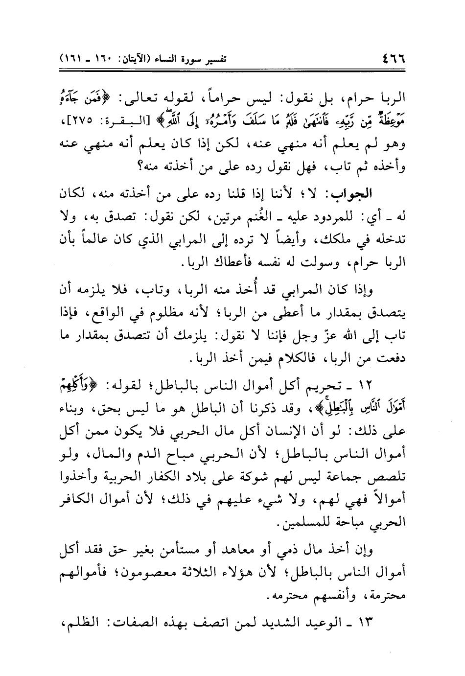 ١٢ - تحريم أكل أموال الناس بالباطل؛ لقوله: {وَأَكْلِهِمْ أَمْوَالَ النَّاسِ بِالْبَاطِلِ}، وقد ذكرنا أن الباطل هو ما ليس بحق، وبناء على ذلك: لو أن الإنسان أكل مال الحربي فلا يكون ممن أكل أموال الناس بالباطل؛ لأن الحربي مباح الدم والمال، ولو تلصص جماعة ليس لهم شوكة على بلاد الكفار الحربية وأخذوا أموالًا فهي لهم، ولا شيء عليهم في ذلك؛ لأن أموال الكافر الحربي مباحة للمسلمين.