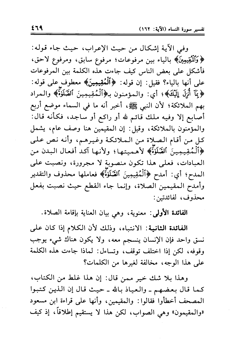 وفي الآية إشكال من حيث الإعراب، حيث جاء قوله: {وَالْمُقِيمِينَ} بالياء بين مرفوعات؛ مرفوع سابق، ومرفوع لاحق، فأشكل على بعض الناس كيف جاءت هذه الكلمة بين المرفوعات على أنها بالياء؟ فقيل: إن قوله: {الْمُقِيمِينَ} معطوف على قوله: {بِمَا أُنْزِلَ إِلَيْكَ}؛ أي: والمؤمنون بـ {الْمُقِيمِينَ الصَّلَاةَ} والمراد بهم الملائكة؛ لأن النبي - صلى الله عليه وسلم -، أخبر أنه ما في السماء موضع أربع أصابع إلا وفيه ملك قائم لله أو راكع أو ساجد، فكأنه قال: والمؤمنون بالملائكة، وقيل: إن المقيمين هنا وصف عام، يشمل كل من أقام الصلاة من الملائكة وغيرهم، وأنه نص على {الْمُقِيمِينَ الصَّلَاةَ} لأهميتها؛ ولأنها آكد أفعال البدن من العبادات، فعلى هذا تكون منصوبة لا مجرورة، ونصبت على المدح؛ أي: أمدح {الْمُقِيمِينَ الصَّلَاةَ} فعاملها محذوف والتقدير وأمدح المقيمين الصلاة، وإنما جاء القطع حيث نصبت بفعل محذوف، لفائدتين:
