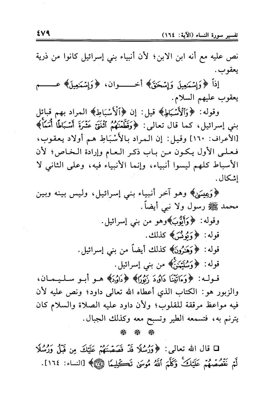وقوله: {وَالْأَسْبَاطِ} قيل: إن {الْأَسْبَاطِ} المراد بهم قبائل بني إسرائيل، كما قال تعالى: {وَقَطَّعْنَاهُمُ اثْنَتَيْ عَشْرَةَ أَسْبَاطًا أُمَمًا} [الأعراف: ١٦٠] وقيل: إن المراد بالأَسْبَاطِ هم أولاد يعقوب، فعلى الأول يكون من باب ذكر العام وإرادة الخاص؛ لأن الأسباط كلهم ليسوا أنبياء، وإنما الأنبياء فيه، وعلى الثاني لا إشكال.