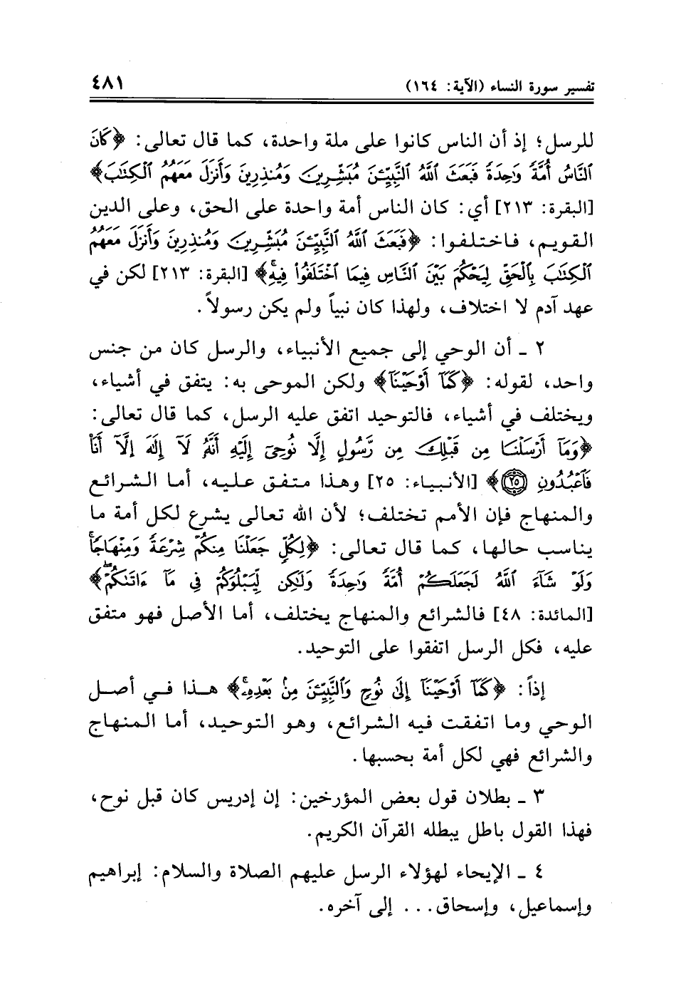 ٢ - أن الوحي إلى جميع الأنبياء، والرسل كان من جنس واحد، لقوله: {كَمَا أَوْحَيْنَا} ولكن الموحى به: يتفق في أشياء، ويختلف في أشياء، فالتوحيد اتفق عليه الرسل، كما قال تعالى: {وَمَا أَرْسَلْنَا مِنْ قَبْلِكَ مِنْ رَسُولٍ إِلَّا نُوحِي إِلَيْهِ أَنَّهُ لَا إِلَهَ إِلَّا أَنَا فَاعْبُدُونِ (٢٥)} [الأنبياء: ٢٥] وهذا متفق عليه، أما الشرائع والمنهاج فإن الأمم تختلف؛ لأن الله تعالى يشرع لكل أمة ما يناسب حالها، كما قال تعالى: {لِكُلٍّ جَعَلْنَا مِنْكُمْ شِرْعَةً وَمِنْهَاجًا وَلَوْ شَاءَ اللَّهُ لَجَعَلَكُمْ أُمَّةً وَاحِدَةً وَلَكِنْ لِيَبْلُوَكُمْ فِي مَا آتَاكُمْ} [المائدة: ٤٨] فالشرائع والمنهاج يختلف، أما الأصل فهو متفق عليه، فكل الرسل اتفقوا على التوحيد.