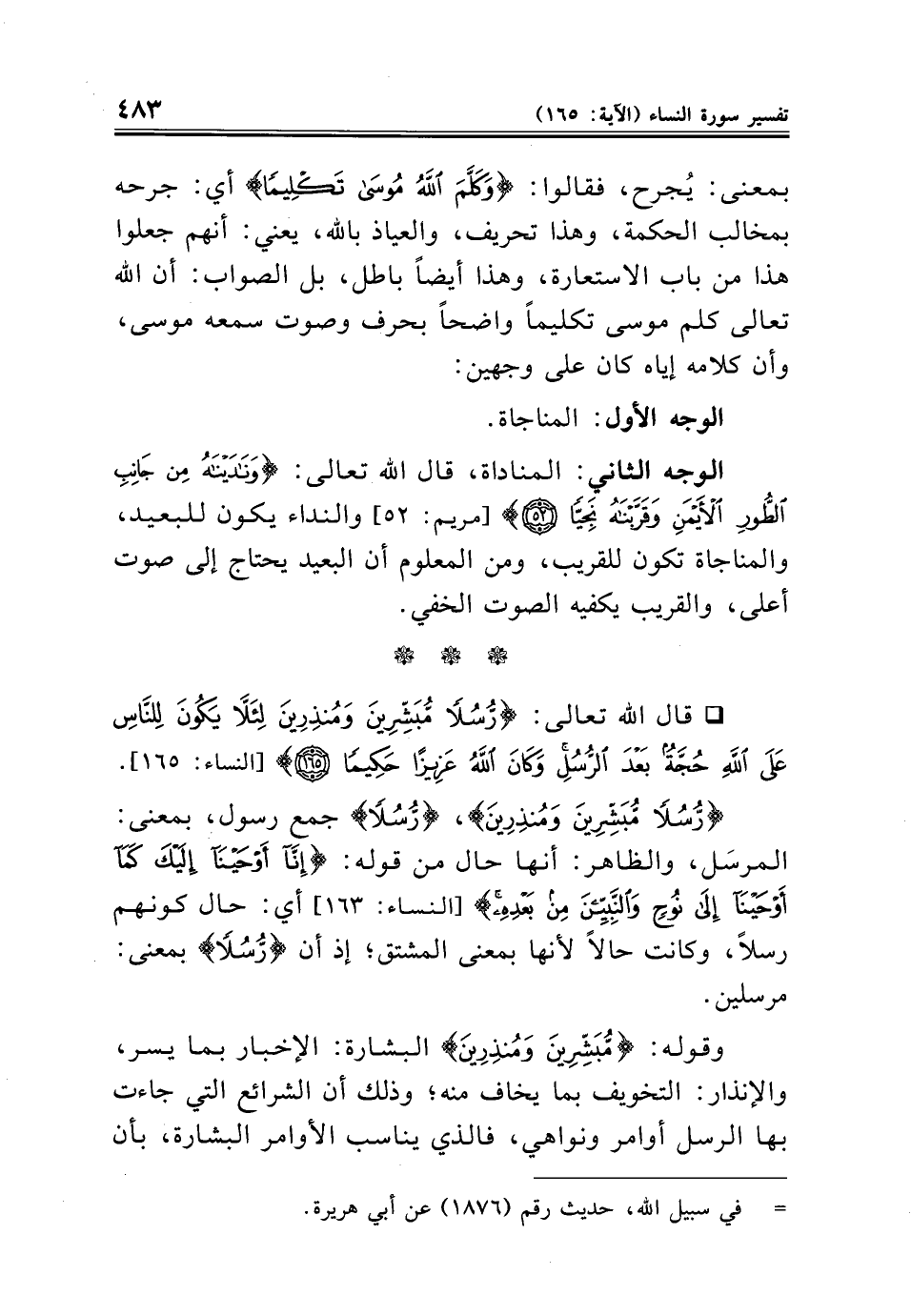 بمعنى: يُجرح، فقالوا: {وَكَلَّمَ اللَّهُ مُوسَى تَكْلِيمًا} أي: جرحه بمخالب الحكمة، وهذا تحريف، والعياذ بالله، يعني: أنهم جعلوا هذا من باب الإستعارة، وهذا أيضًا باطل، بل الصواب: أن الله تعالى كلم موسى تكليمًا واضحًا بحرف وصوت سمعه موسى، وأن كلامه إياه كان على وجهين: