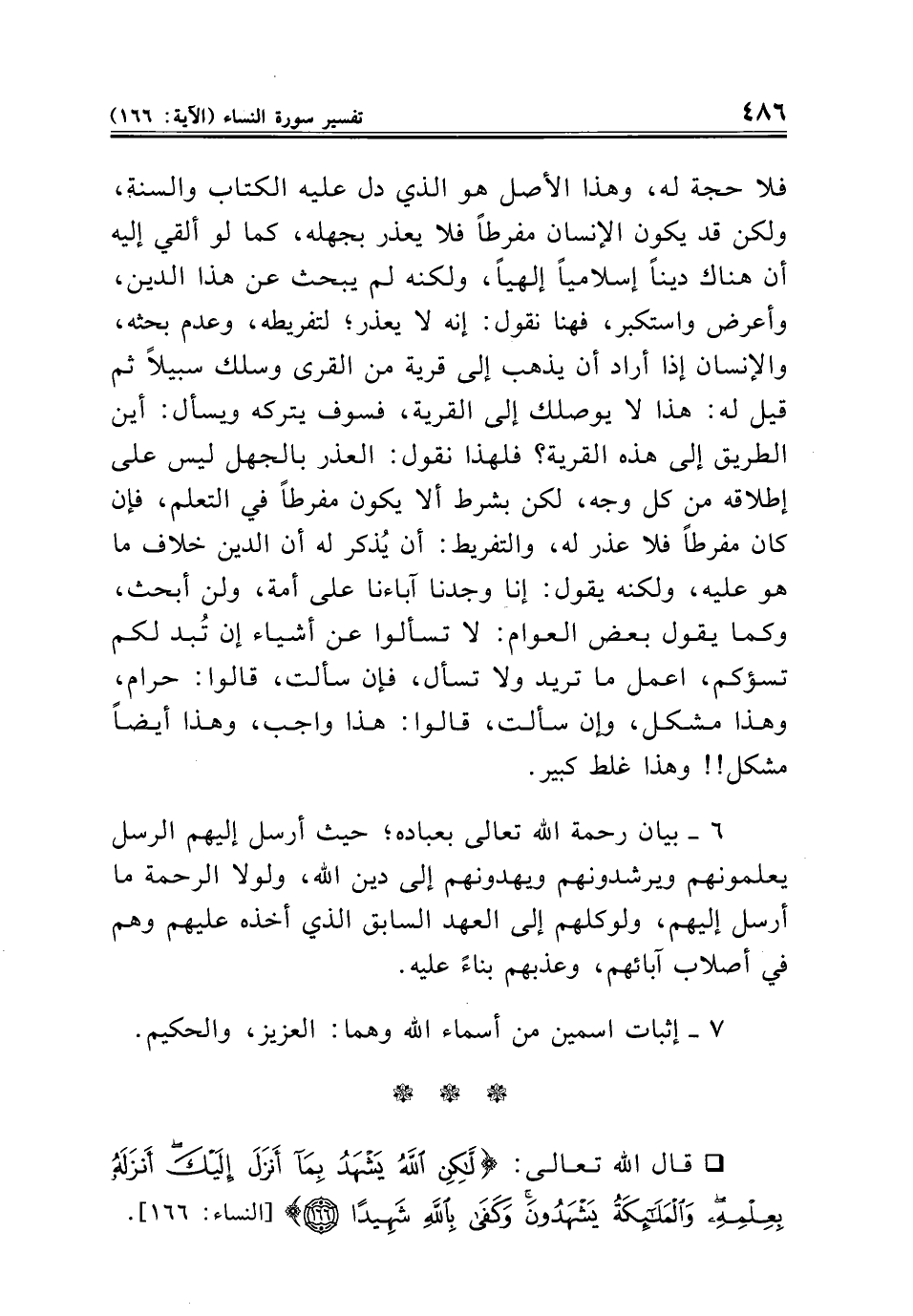 فلا حجة له، وهذا الأصل هو الذي دل عليه الكتاب والسنة، ولكن قد يكون الإنسان مفرطًا فلا يعذر بجهله، كما لو ألقي إليه أن هناك دينًا إسلاميًا إلهيًا، ولكنه لم يبحث عن هذا الدين، وأعرض واستكبر، فهنا نقول: إنه لا يعذر؛ لتفريطه، وعدم بحثه، والإنسان إذا أراد أن يذهب إلى قرية من القرى وسلك سبيلًا ثم قيل له: هذا لا يوصلك إلى القرية، فسوف يتركه ويسأل: أين الطريق إلى هذه القرية؟ فلهذا نقول: العذر بالجهل ليس على إطلاقه من كل وجه، لكن بشرط ألا يكون مفرطًا في التعلم، فإن كان مفرطًا فلا عذر له، والتفريط: أن يُذكر له أن الدين خلاف ما هو عليه، ولكنه يقول: إنا وجدنا آباءنا على أمة، ولن أبحث، وكما يقول بعض العوام: لا تسألوا عن أشياء إن تُبد لكم تسؤكم، اعمل ما تريد ولا تسأل، فإن سألت، قالوا: حرام، وهذا مشكل، وإن سألت، قالوا: هذا واجب، وهذا أيضًا مشكل!! وهذا غلط كبير.