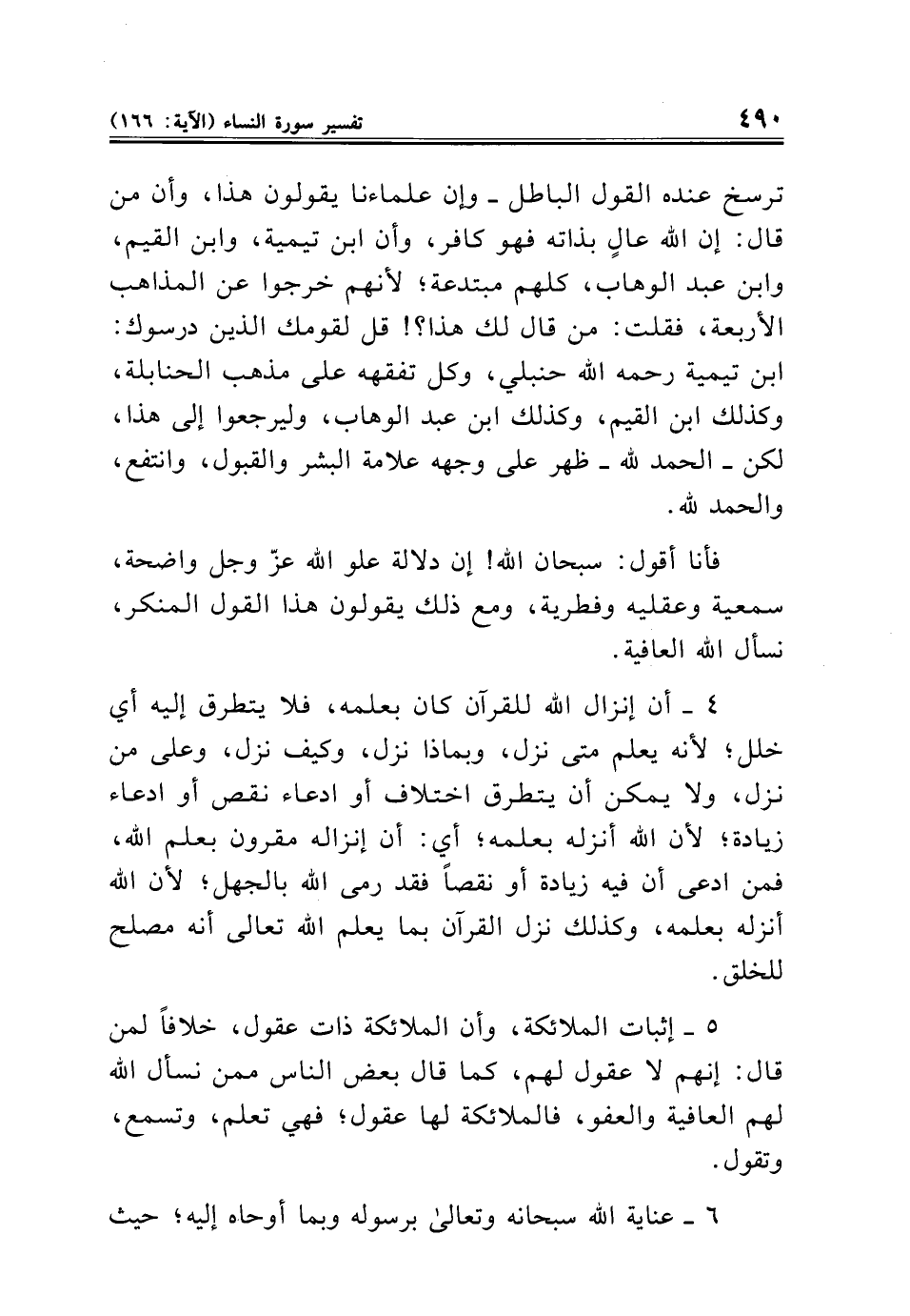 ٤ - أن إنزال الله للقرآن كان بعلمه، فلا يتطرق إليه أي خلل؛ لأنه يعلم متى نزل، وبماذا نزل، وكيف نزل، وعلى من نزل، ولا يمكن أن يتطرق اختلاف أو ادعاء نقص أو ادعاء زيادة؛ لأن الله أنزله بعلمه؛ أي: أن إنزاله مقرون بعلم الله، فمن ادعى أن فيه زيادة أو نقصًا فقد رمى الله بالجهل؛ لأن الله أنزله بعلمه، وكذلك نزل القرآن بما يعلم الله تعالى أنه مصلح للخلق.