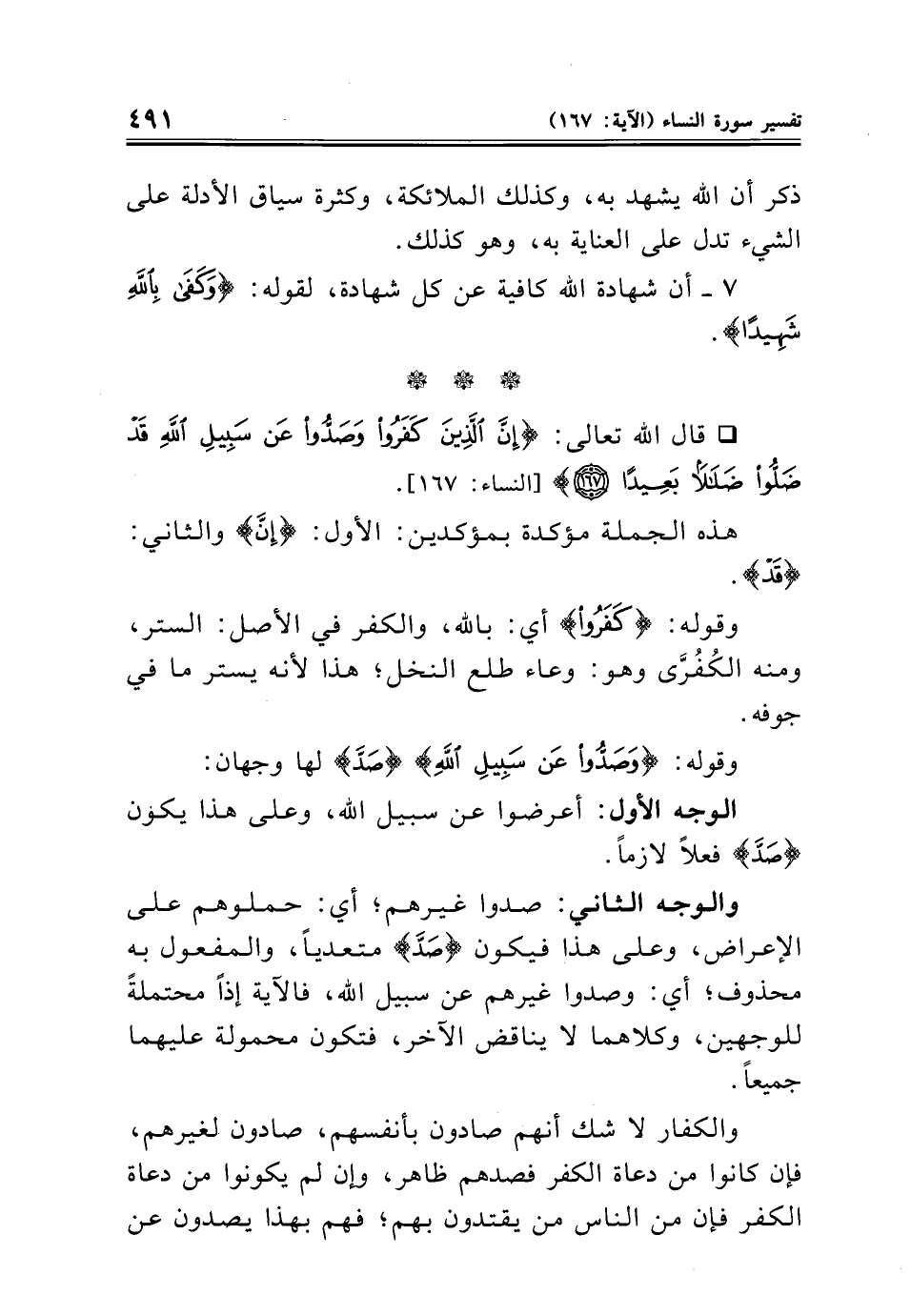 والوجه الثاني: صدوا غيرهم؛ أي: حملوهم على الإعراض، وعلى هذا فيكون (صَدَّ) متعديًا، والمفعول به محذوف؛ أي: وصدوا غيرهم عن سبيل الله، فالآية إذًا محتملةً للوجهين، وكلاهما لا يناقض الآخر، فتكون محمولة عليهما جميعًا.