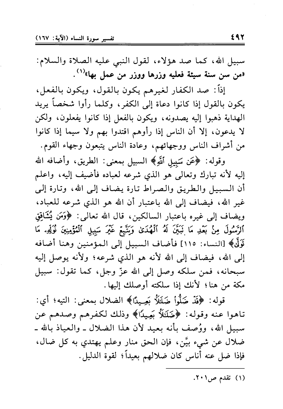 وقوله: {عَنْ سَبِيلِ اللَّهِ} السبيل بمعنى: الطريق، وأضافه الله إليه لأنه تبارك وتعالى هو الذي شرعه لعباده فأضيف إليه، واعلم أن السبيل والطريق والصراط تارة يضاف إلى الله، وتارة إلى غير الله، فيضاف إلى الله باعتبار أن الله هو الذي شرعه للعباد، ويضاف إلى غيره باعتبار السالكين، قال الله تعالى: {وَمَنْ يُشَاقِقِ الرَّسُولَ مِنْ بَعْدِ مَا تَبَيَّنَ لَهُ الْهُدَى وَيَتَّبِعْ غَيْرَ سَبِيلِ الْمُؤْمِنِينَ نُوَلِّهِ مَا تَوَلَّى} [النساء: ١١٥] فأضاف السبيل إلى المؤمنين وهنا أضافه إلى الله، فيضاف إلى الله لأنه هو الذي شرعه؛ ولأنه يوصل إليه سبحانه، فمن سلكه وصل إلى الله عزّ وجل، كما تقول: سبيل مكة من هنا؛ لأنك إذا سلكته أوصلك إليها.