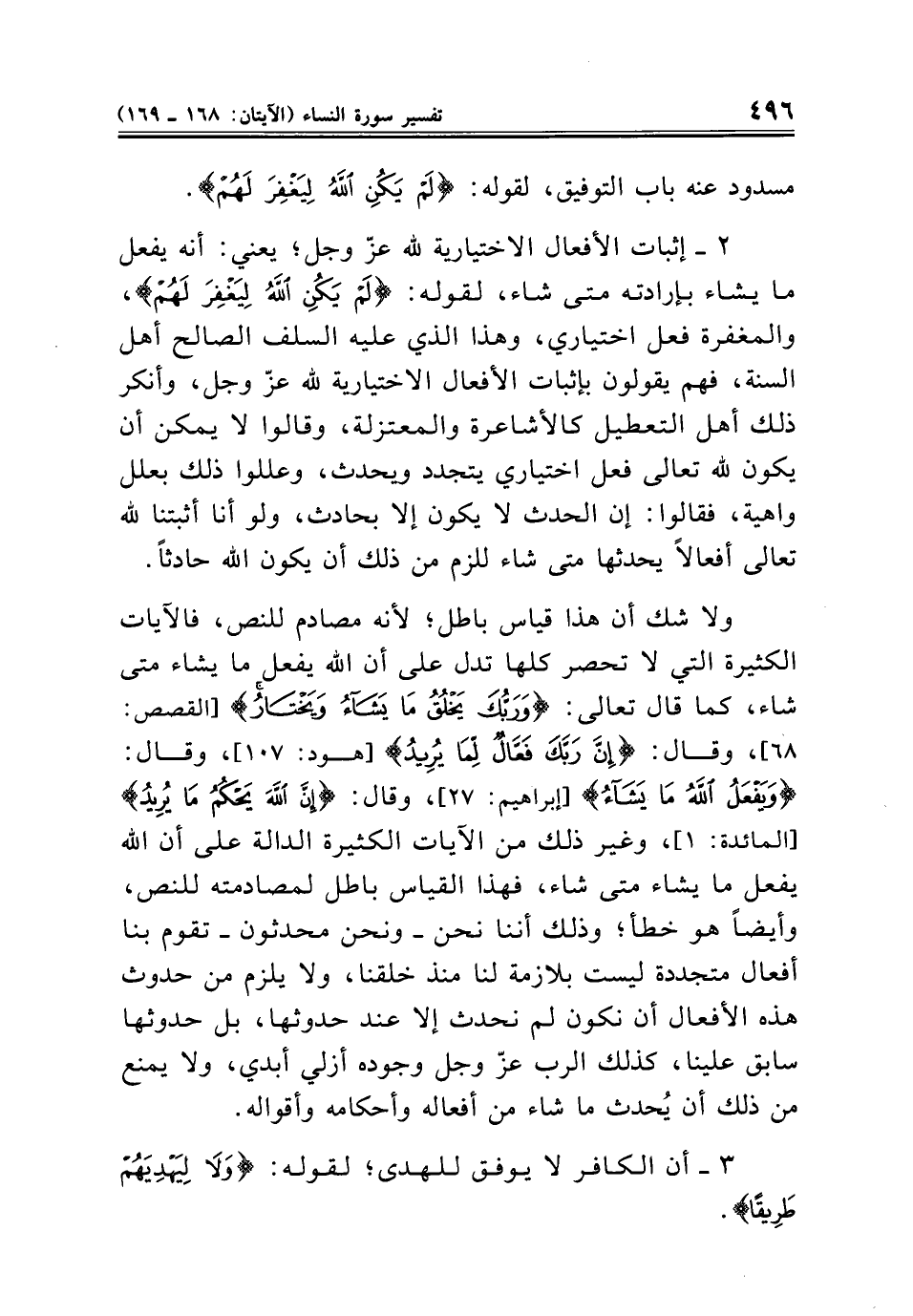 ٢ - إثبات الأفعال الإختيارية لله عزّ وجل؛ يعني: أنه يفعل ما يشاء بإرادته متى شاء، لقوله: {لَمْ يَكُنِ اللَّهُ لِيَغْفِرَ لَهُمْ}، والمغفرة فعل اختياري، وهذا الذي عليه السلف الصالح أهل السنة، فهم يقولون بإثبات الأفعال الإختيارية لله عزّ وجل، وأنكر ذلك أهل التعطيل كالأشاعرة والمعتزلة، وقالوا لا يمكن أن يكون لله تعالى فعل اختياري يتجدد ويحدث، وعللوا ذلك بعلل واهية، فقالوا: إن الحدث لا يكون إلا بحادث، ولو أنا أثبتنا لله تعالى أفعالًا يحدثها متى شاء للزم من ذلك أن يكون الله حادثًا.