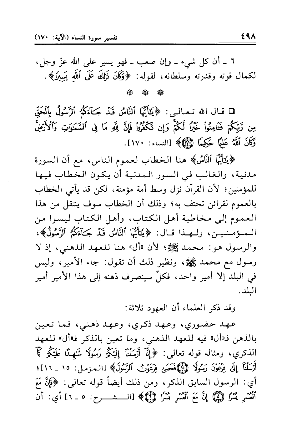 {يَاأَيُّهَا النَّاسُ} هنا الخطاب لعموم الناس، مع أن السورة مدنية، والغالب في السور المدنية أن يكون الخطاب فيها للمؤمنين؛ لأن القرآن نزل وسط أمة مؤمنة، لكن قد يأتي الخطاب بالعموم لقرائن تحتف به؛ وذلك أن الخطاب سوف ينتقل من هذا العموم إلى مخاطبة أهل الكتاب، وأهل الكتاب ليسوا من المؤمنين، ولهذا قال: {يَاأَيُّهَا النَّاسُ قَدْ جَاءَكُمُ الرَّسُولُ}، والرسول هو: محمد - صلى الله عليه وسلم -؛ لأن "أل" هنا للعهد الذهني، إذ لا رسول مع محمد - صلى الله عليه وسلم -، ونظير ذلك أن تقول: جاء الأمير، وليس في البلد إلا أمير واحد، فكلٌ سينصرف ذهنه إلى هذا الأمير أمير البلد.