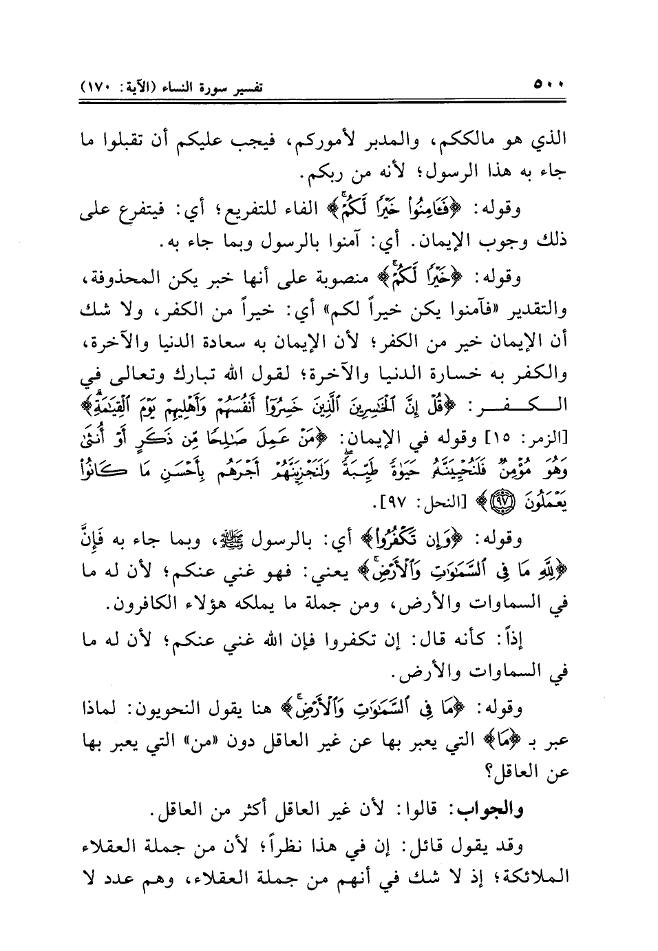 وقوله: {مَا فِي السَّمَاوَاتِ وَالْأَرْضِ} هنا يقول النحويون: لماذا عبر بـ {مَا} التي يعبر بها عن غير العاقل دون "من" التي يعبر بها عن العاقل؟