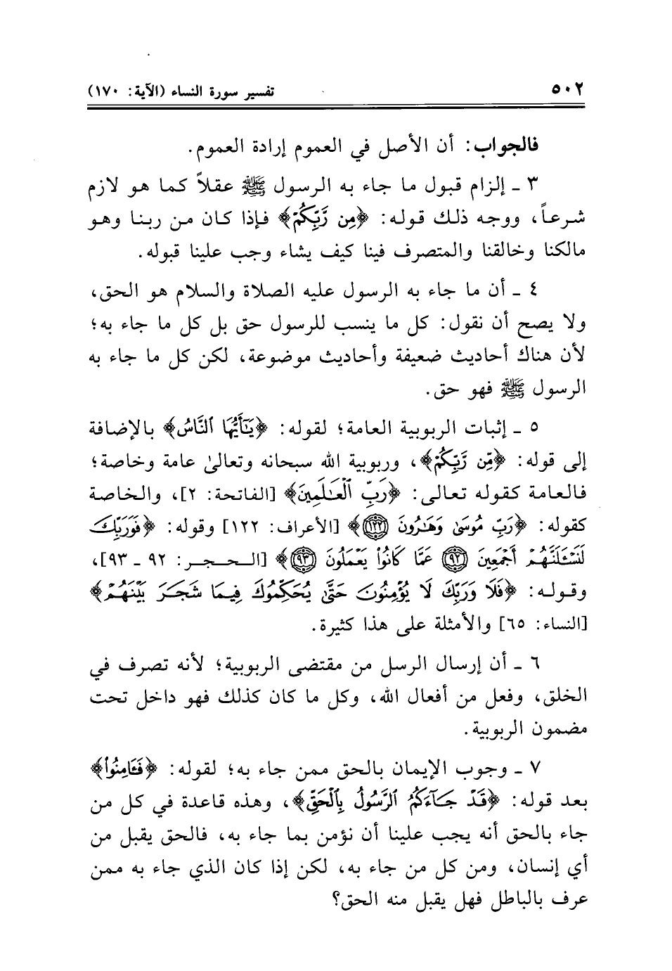 ٥ - إثبات الربوبية العامة؛ لقوله: {يَاأَيُّهَا النَّاسُ} بالإضافة إلى قوله: {مِنْ رَبِّكُمْ}، وربوبية الله سبحانه وتعالى عامة وخاصة؛ فالعامة كقوله تعالى: {رَبِّ الْعَالَمِينَ} [الفاتحة: ٢]، والخاصة كقوله: {رَبِّ مُوسَى وَهَارُونَ (١٢٢)} [الأعراف: ١٢٢] وقوله: {فَوَرَبِّكَ لَنَسْأَلَنَّهُمْ أَجْمَعِينَ (٩٢) عَمَّا كَانُوا يَعْمَلُونَ (٩٣)} [الحجر: ٩٢ - ٩٣] , وقوله: {فَلَا وَرَبِّكَ لَا يُؤْمِنُونَ حَتَّى يُحَكِّمُوكَ فِيمَا شَجَرَ بَيْنَهُمْ} [النساء: ٦٥] والأمثلة على هذا كثيرة.