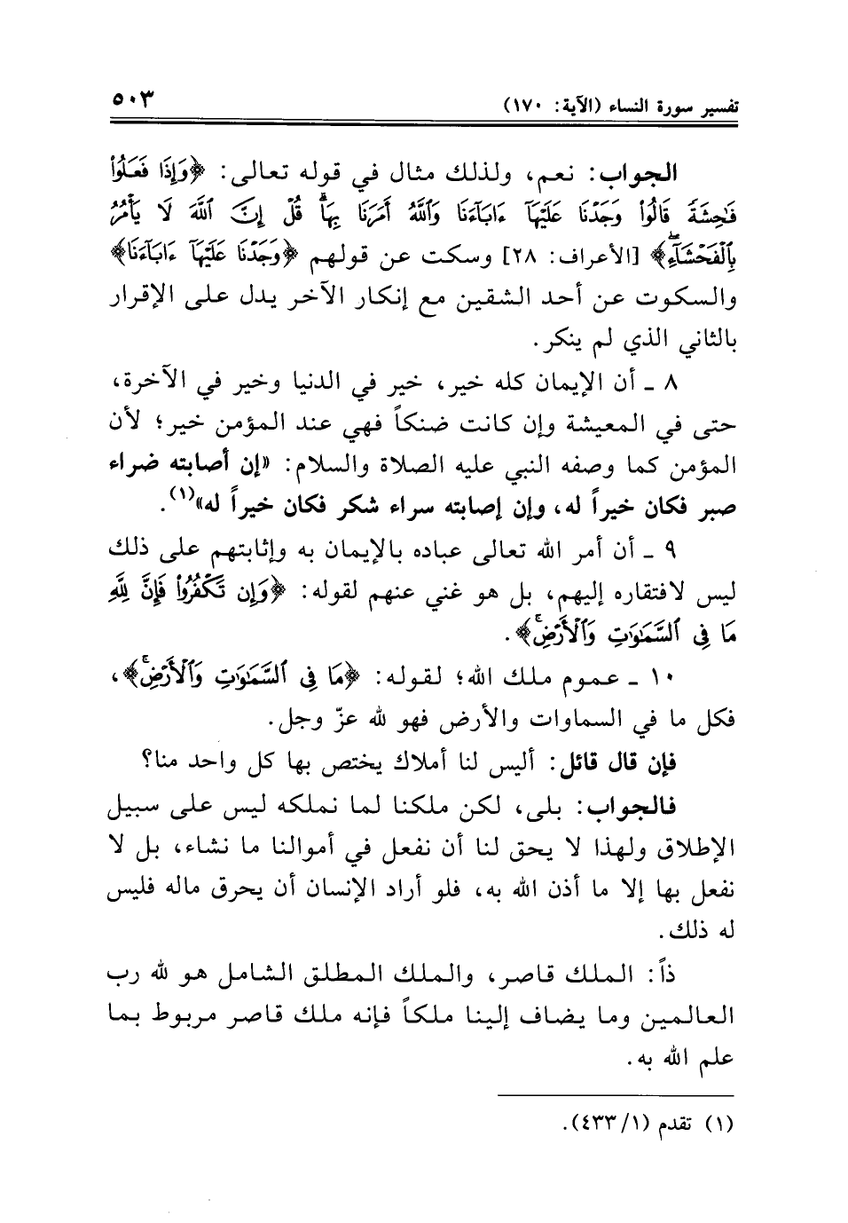 إذًا: الملك قاصر، والملك المطلق الشامل هو لله رب العالمين وما يضاف إلينا ملكًا فإنه ملك قاصر مربوط بما علم الله به.