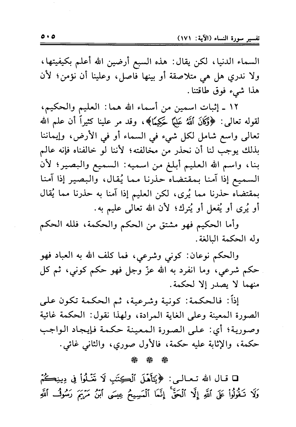 ١٢ - إثبات اسمين من أسماء الله هما: العليم والحكيم، لقوله تعالى: {وَكَانَ اللَّهُ عَلِيمًا حَكِيمًا}، وقد مر علينا كثيرًا أن علم الله تعالى واسع شامل لكل شيء في السماء أو في الأرض، وإيماننا بذلك يوجب لنا أن نحذر من مخالفته؛ لأننا لو خالفناه فإنه عالم بنا، واسم الله العليم أبلغ من اسميه: السميع والبصير؛ لأن السميع إذا آمنا بمقتضاه حذرنا مما يُقال، والبصير إذا آمنا بمقتضاه حذرنا مما يُرى، لكن العليم إذا آمنا به حذرنا مما يُقال أو يُرى أو يُفعل أو يُترك؛ لأن الله تعالى عليم به.