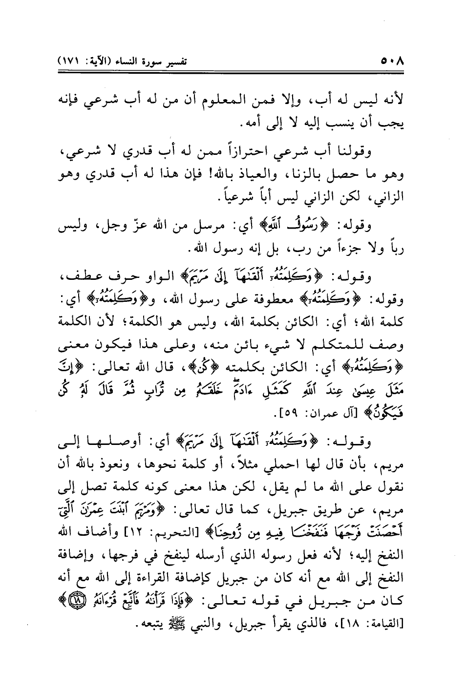 وقوله: {وَكَلِمَتُهُ أَلْقَاهَا إِلَى مَرْيَمَ} الواو حرف عطف، وقوله: {وَكَلِمَتُهُ} معطوفة على رسول الله، {وَكَلِمَتُهُ} أي: كلمة الله؛ أي: الكائن بكلمة الله، وليس هو الكلمة؛ لأن الكلمة وصف للمتكلم لا شيء بائن منه، وعلى هذا فيكون معنى {وَكَلِمَتُهُ} أي: الكائن بكلمته {كُنْ}، قال الله تعالى: {إِنَّ مَثَلَ عِيسَى عِنْدَ اللَّهِ كَمَثَلِ آدَمَ خَلَقَهُ مِنْ تُرَابٍ ثُمَّ قَالَ لَهُ كُنْ فَيَكُونُ} [آل عمران: ٥٩].