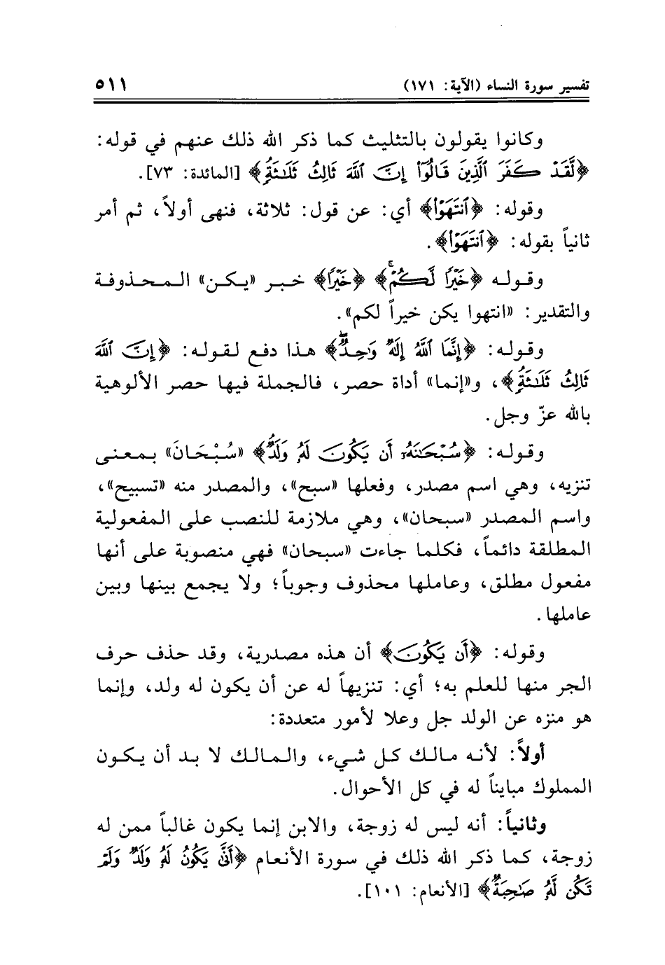 وقوله: {سُبْحَانَهُ أَنْ يَكُونَ لَهُ وَلَدٌ} "سُبْحَانَ" بمعنى تنزيه، وهي اسم مصدر، وفعلها "سبح"، والمصدر منه "تسبيح"، واسم المصدر "سبحان"، وهي ملازمة للنصب على المفعولية المطلقة دائمًا، فكلما جاءت "سبحان" فهي منصوبة على أنها مفعول مطلق، وعاملها محذوف وجوبًا؛ ولا يجمع بينها وبين عاملها.