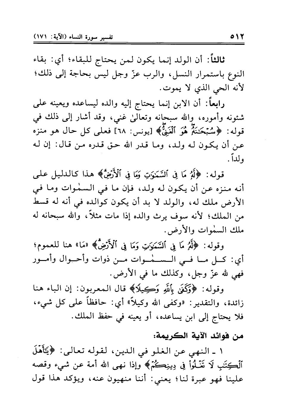 رابعًا: أن الإبن إنما يحتاج إليه والده ليساعده ويعينه على شئونه وأموره، والله سبحانه وتعالى غني، وقد أشار إلى ذلك في قوله: {سُبْحَانَهُ هُوَ الْغَنِيُّ} [يونس: ٦٨] فعلى كل حال هو منزه عن أن يكون له ولد، وما قدر الله حق قدره من قال: إن له ولدًا.