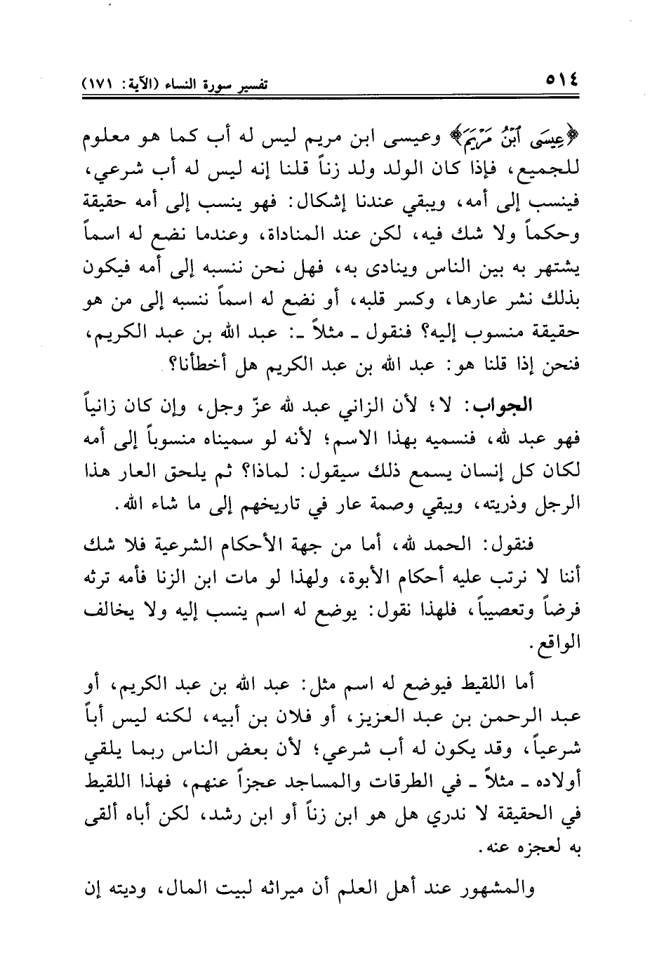 {عِيسَى ابْنُ مَرْيَمَ} وعيسى ابن مريم ليس له أب كما هو معلوم للجميع، فإذا كان الولد ولد زنًا قلنا إنه ليس له أب شرعي، فينسب إلى أمه، ويبقي عندنا إشكال: فهو ينسب إلى أمه حقيقة وحكمًا ولا شك فيه، لكن عند المناداة، وعندما نضع له اسمًا يشتهر به بين الناس وينادى به، فهل نحن ننسبه إلى أمه فيكون بذلك نشر عارها، وكسر قلبه، أو نضع له اسمًا ننسبه إلى من هو حقيقة منسوب إليه؟ فنقول - مثلًا -: عبد الله بن عبد الكريم، فنحن إذا قلنا هو: عبد الله بن عبد الكريم هل أخطأنا؟