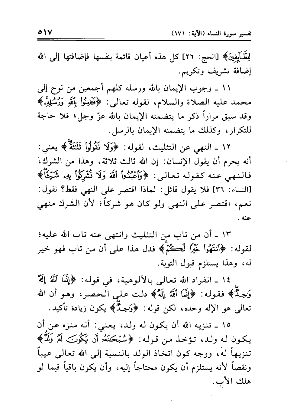 ١٣ - أن من تاب من التثليث وانتهى عنه تاب الله عليه؛ لقوله: {انْتَهُوا خَيْرًا لَكُمْ} فدل هذا على أن من تاب فهو خير له، وهذا يستلزم قبول التوبة.