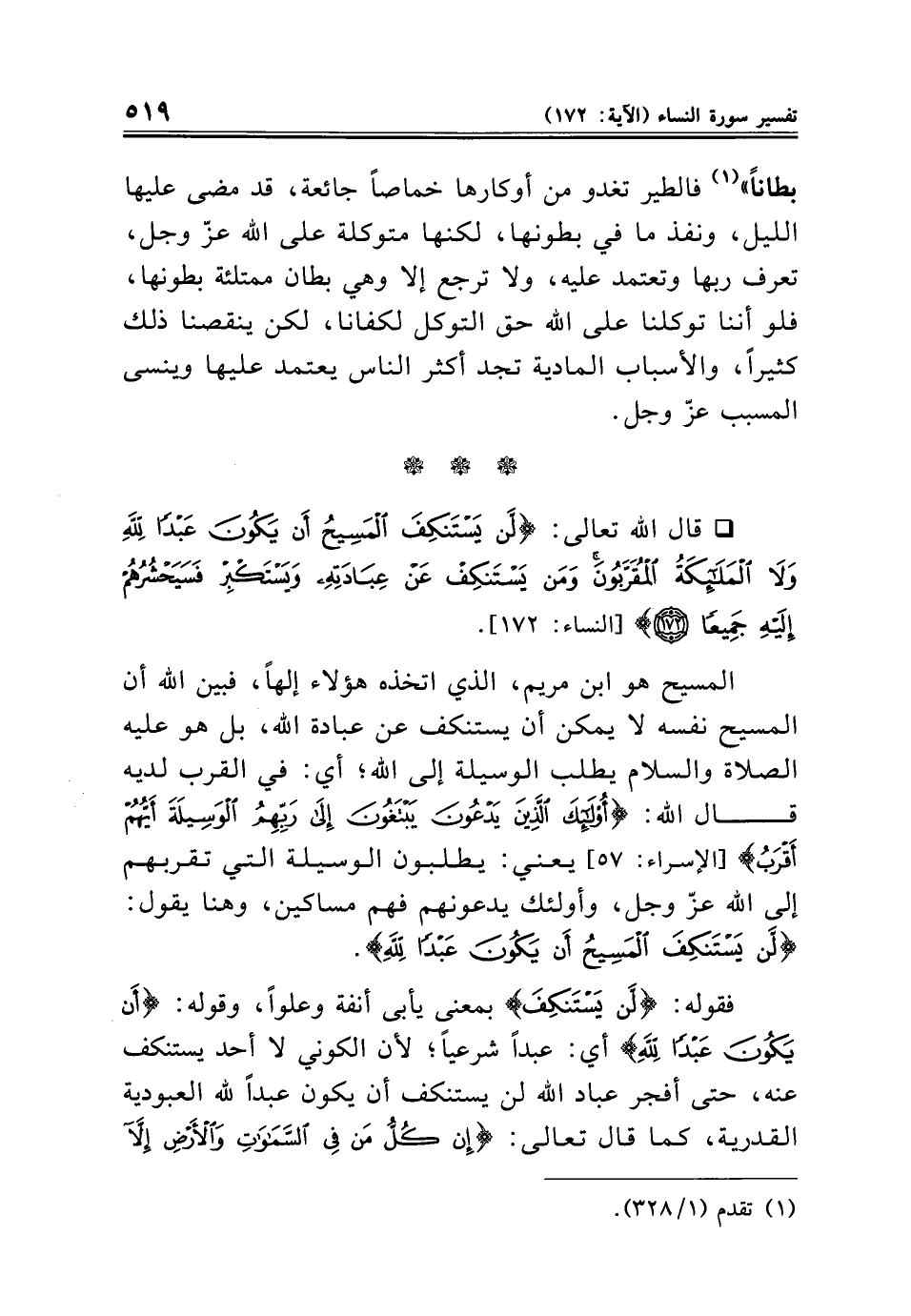 المسيح هو ابن مريم، الذي اتخذه هؤلاء إلهًا، فبين الله أن المسيح نفسه لا يمكن أن يستنكف عن عبادة الله، بل هو عليه الصلاة والسلام يطلب الوسيلة إلى الله؛ أي: في القرب لديه قال الله: {أُولَئِكَ الَّذِينَ يَدْعُونَ يَبْتَغُونَ إِلَى رَبِّهِمُ الْوَسِيلَةَ أَيُّهُمْ أَقْرَبُ} [الإسراء: ٥٧] يعني: يطلبون الوسيلة التي تقربهم إلى الله عزّ وجل، وأولئك يدعونهم فهم مساكين، وهنا يقول: {لَنْ يَسْتَنْكِفَ الْمَسِيحُ أَنْ يَكُونَ عَبْدًا لِلَّهِ}.