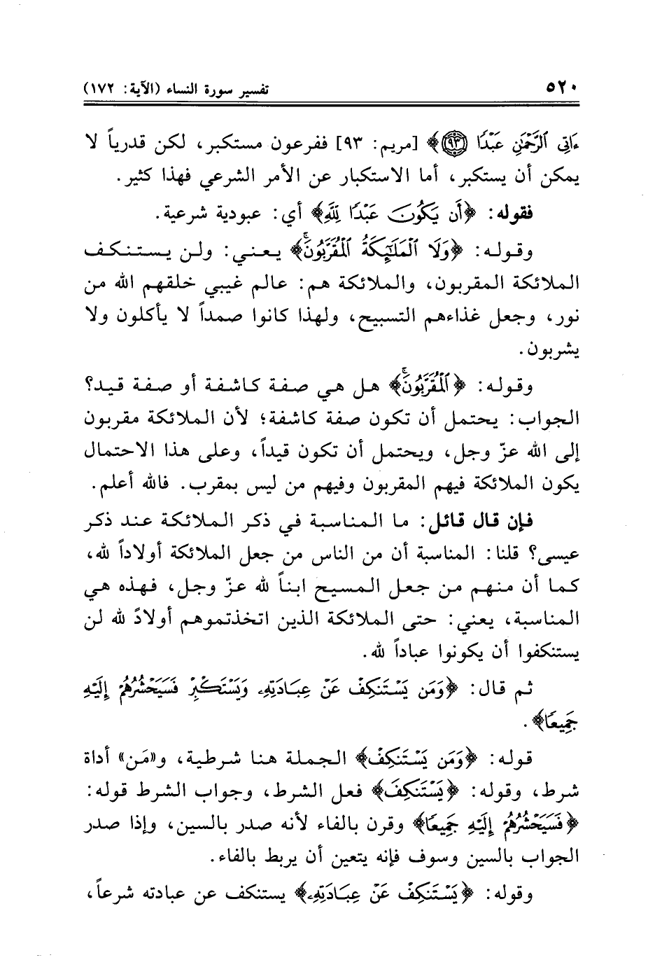 فإن قال قائل: ما المناسبة في ذكر الملائكة عند ذكر عيسى؟ قلنا: المناسبة أن من الناس من جعل الملائكة أولادًا لله، كما أن منهم من جعل المسيح ابنًا لله عزّ وجل، فهذه هي المناسبة، يعني: حتى الملائكة الذين اتخذتموهم أولادًا لله لن يستنكفوا أن يكونوا عبادًا لله.